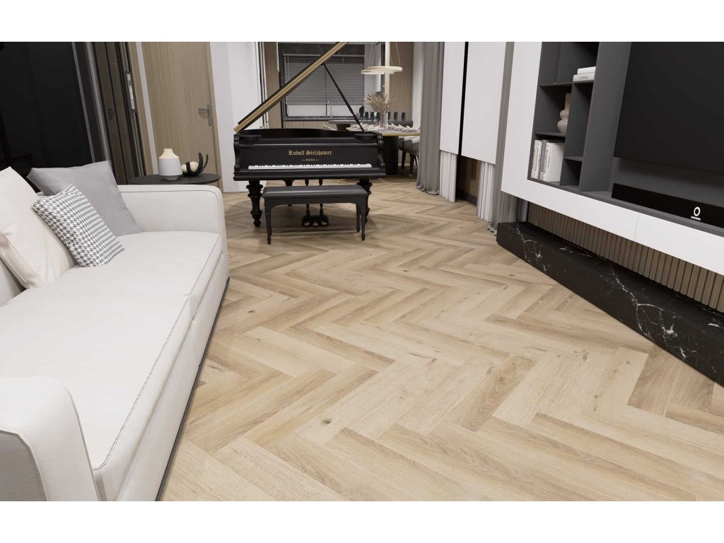 - Pokládka do stromečku (herringbone) – speciální formát L/P lamel pro klasický „rybí kost“ vzor.