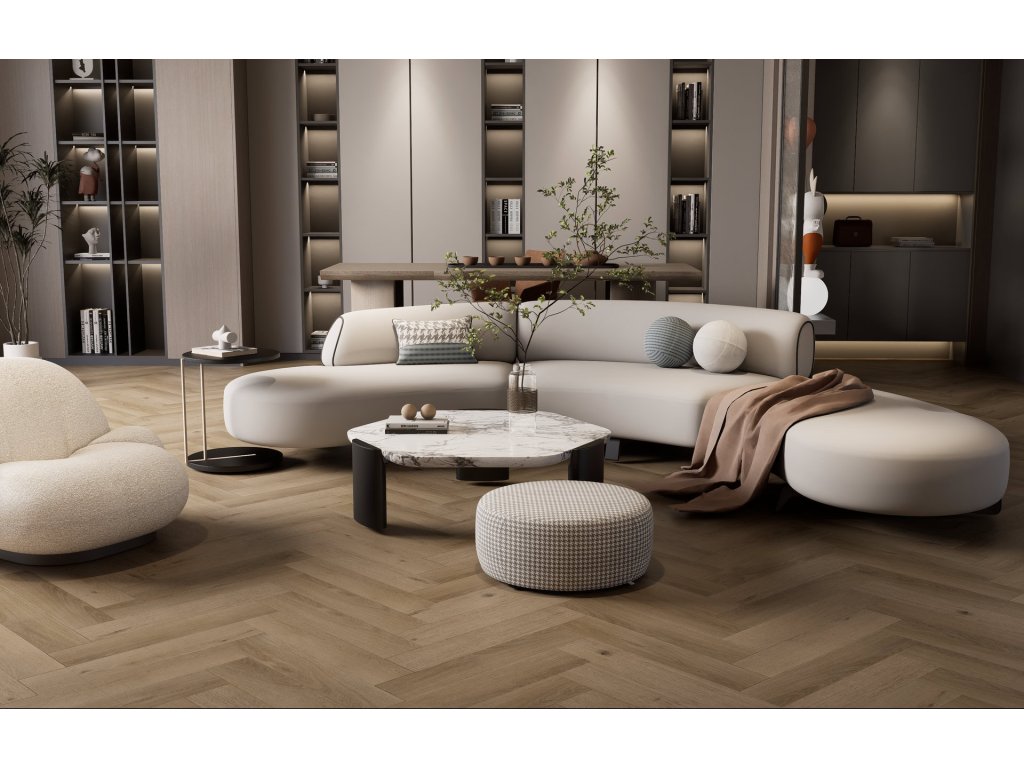 Dub Natur Elegance představuje přirozený dubový dekor s vyváženým odstínem a jemnou, klidnou kresbou. Nepůsobí ani příliš světlým, ani tmavým dojmem, díky čemuž se snadno kombinuje s různými styly interiéru. Matný povrch s mikro V-drážkou podtrhuje parketový charakter pokládky do stromečku a zajišťuje nadčasový, harmonický vzhled.