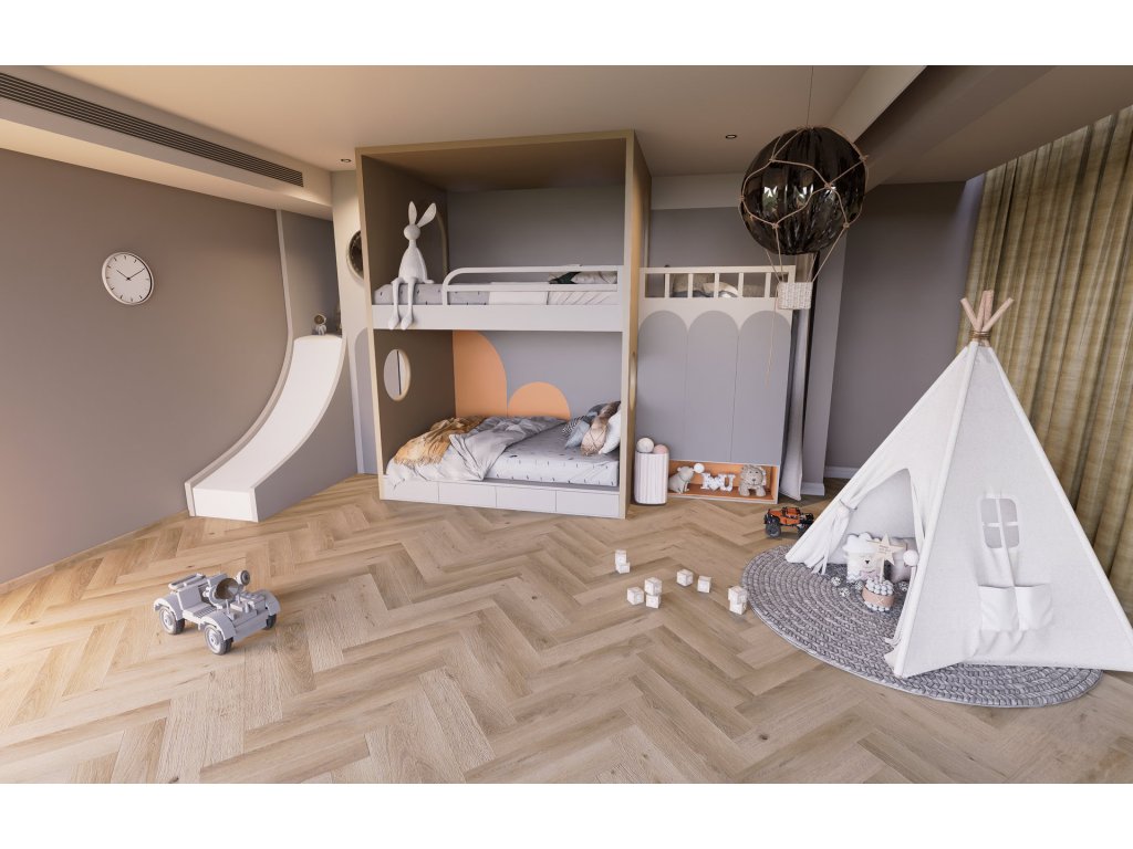 Vinylová plovoucí podlaha BUKOMA HERRINGBONE U-CLICK s integrovanou podložkou v dekoru Dub Natur Elegance nabízí dokonale vyvážený, přirozený vzhled dubového dřeva, který nepodléhá trendům a snadno se kombinuje s různými styly interiéru. Pokládka do stromečku dodává podlaze jemnou eleganci, aniž by prostor působil rušivě. Registrovaný emboss, decentní kresba a mikro V-drážka podtrhují realistický dojem dřeva, zatímco vinylová konstrukce zajišťuje vysokou odolnost a komfort každodenního užívání. Ideální volba pro ty, kdo hledají nadčasovou a univerzální podlahu.
