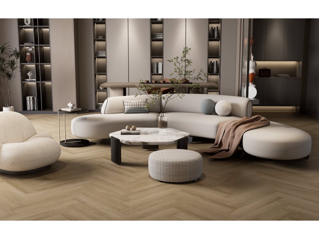 Vinylová plovoucí podlaha BUKOMA HERRINGBONE U-CLICK s integrovanou podložkou v dekoru Dub Pískový Elegance rozjasní interiér a dodá mu lehký, přirozený charakter inspirovaný světlým dubem. Pokládka do stromečku vytváří elegantní rytmus podlahy, který prostor opticky zvětšuje a působí velmi čistě. Registrovaný emboss a jemná mikro V-drážka zvýrazňují autentickou kresbu dřeva, zatímco odolný vinylový povrch zajišťuje bezstarostné používání v každodenním provozu. Skvělá volba pro moderní, světlé a vzdušné interiéry.