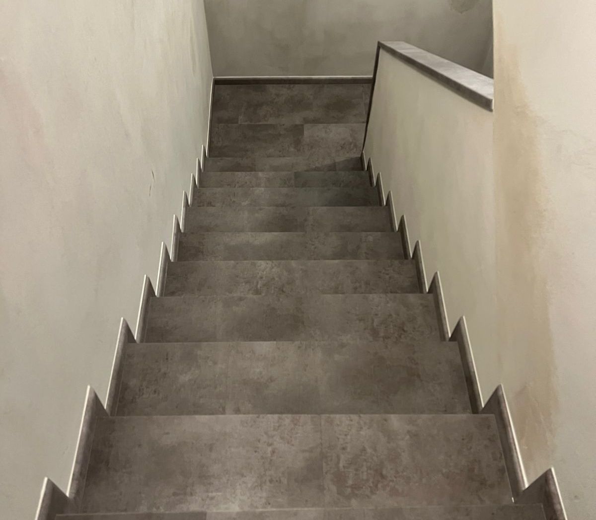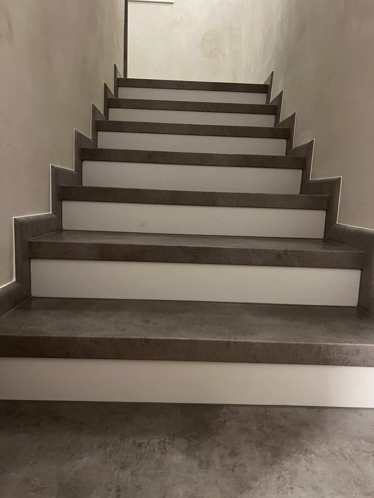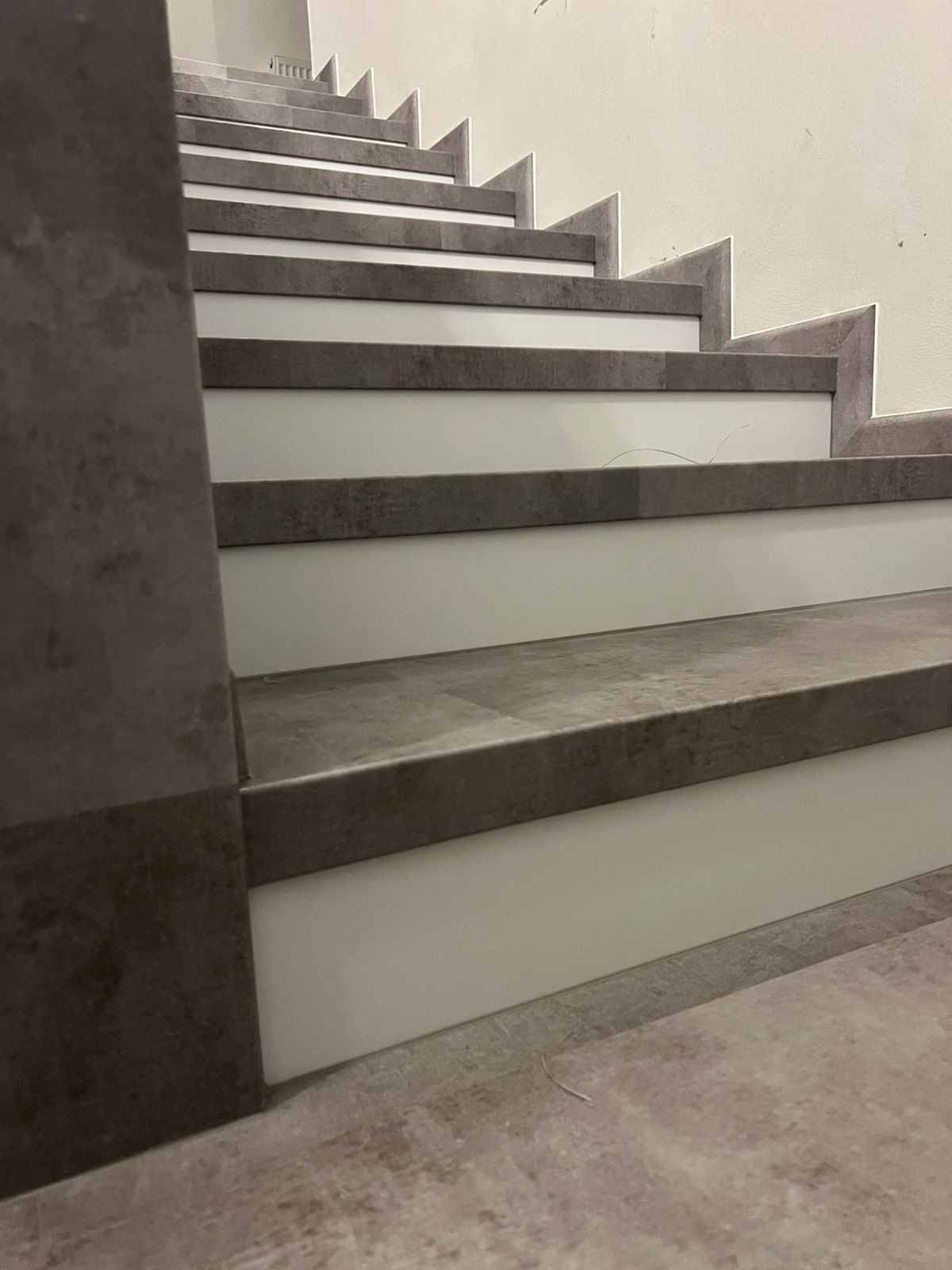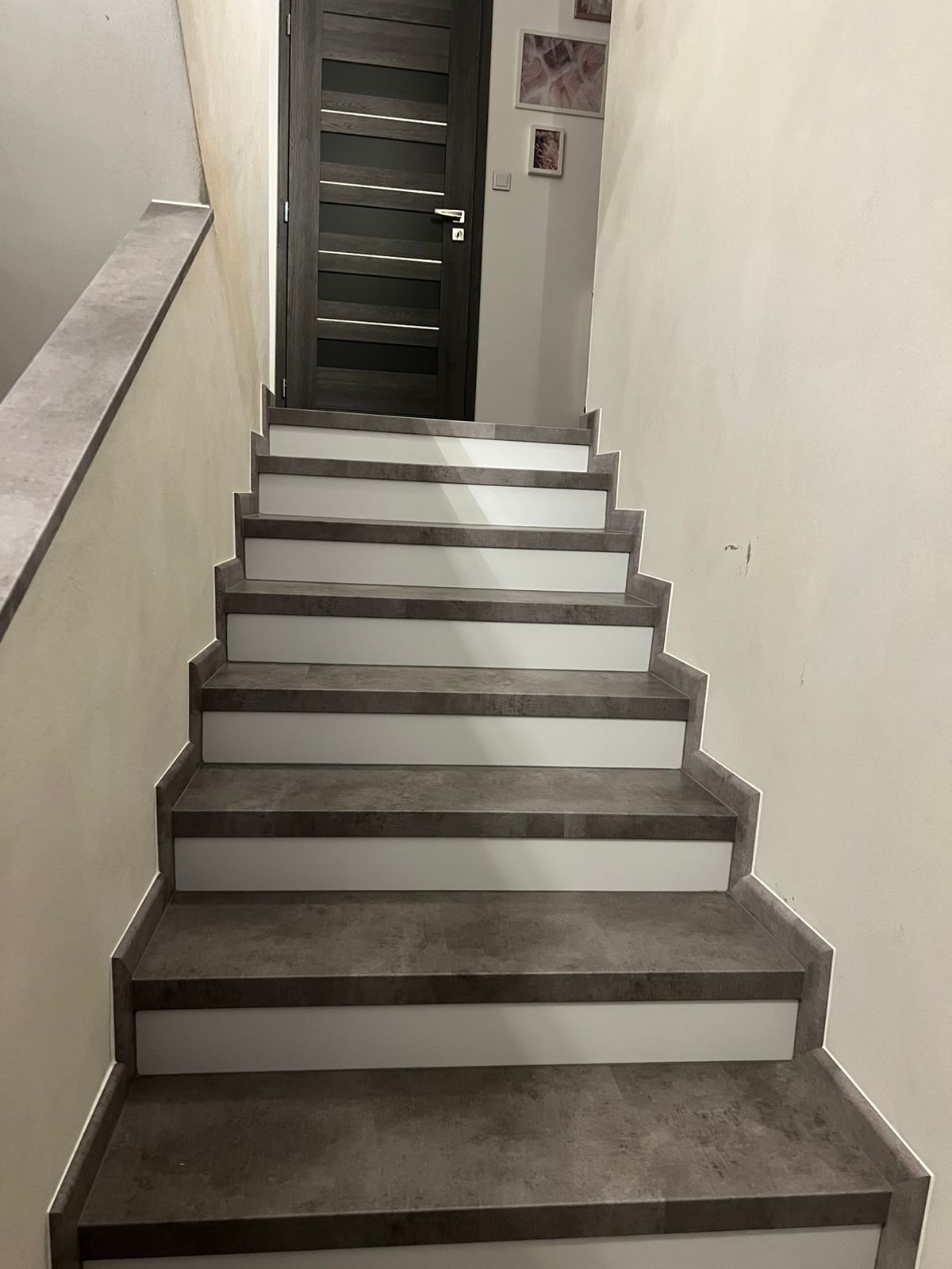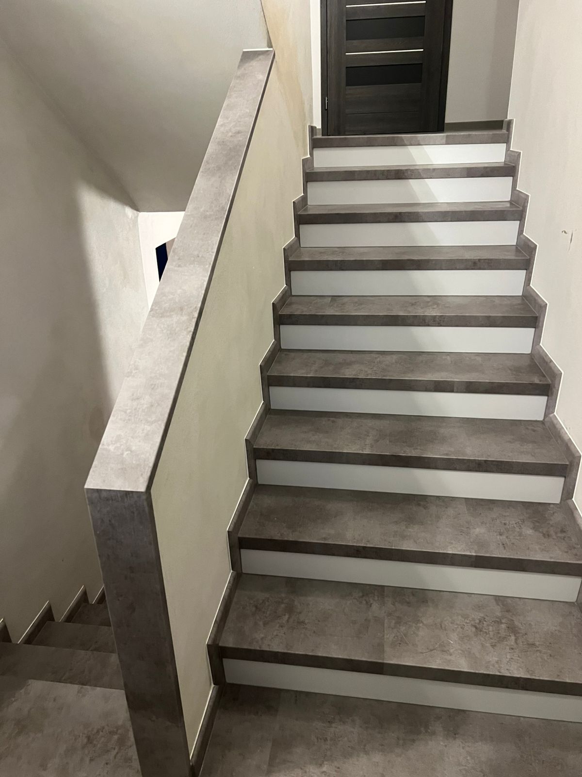 Ukázka práce podlahářů z BUKOMY. Betonové schodiště s původními keramickými obklady jsme obložili vinylovou podlahou s ohyby BUKOMA STONE U‑CLICK XL Beton Kámen Šedohnědý. Bílé podstupnice jsou z BUKOMA StairWhite SPC 4.0 a celek je dotažen soklovými lištami BUKOMA PROFI‑60 v dekoru podlahy. Výsledkem jsou schody s čistou bílou podstupnicí a moderním minerálním vzhledem nášlapů.