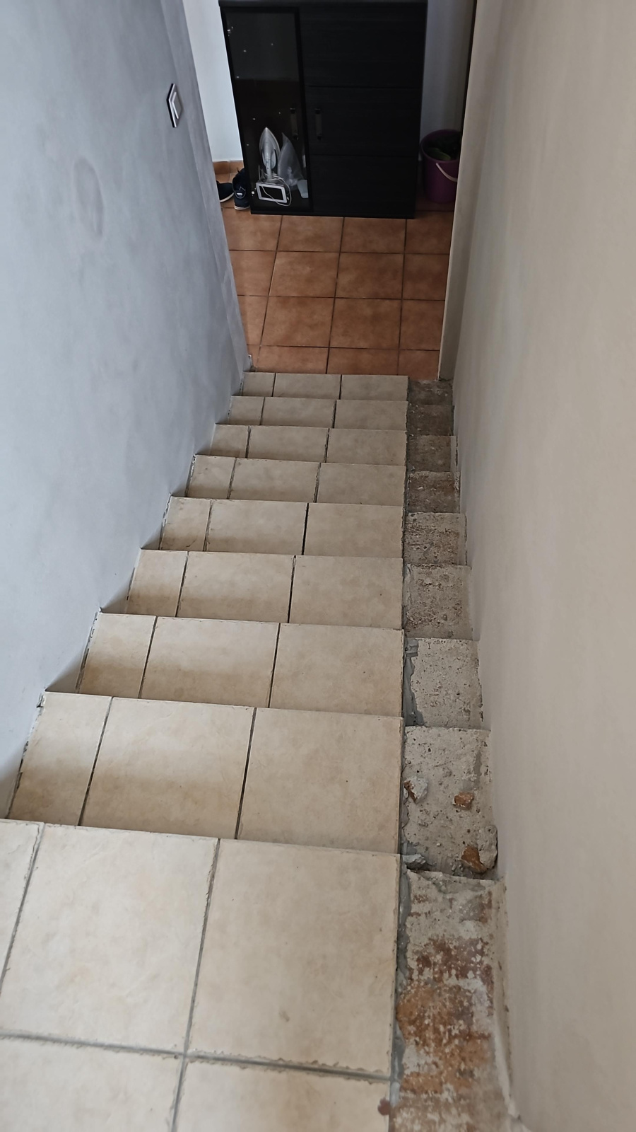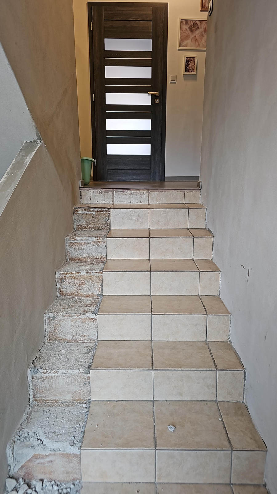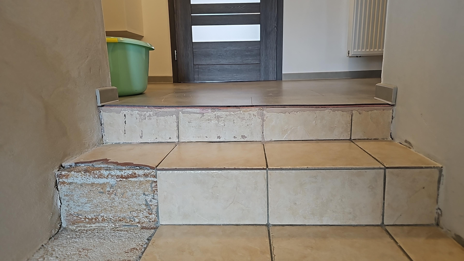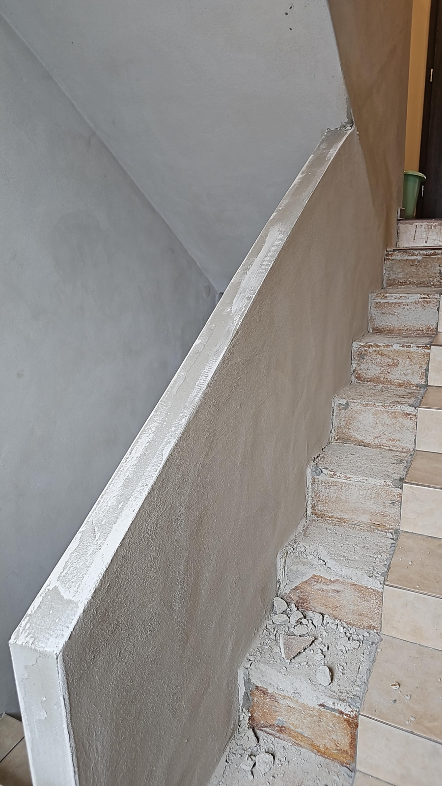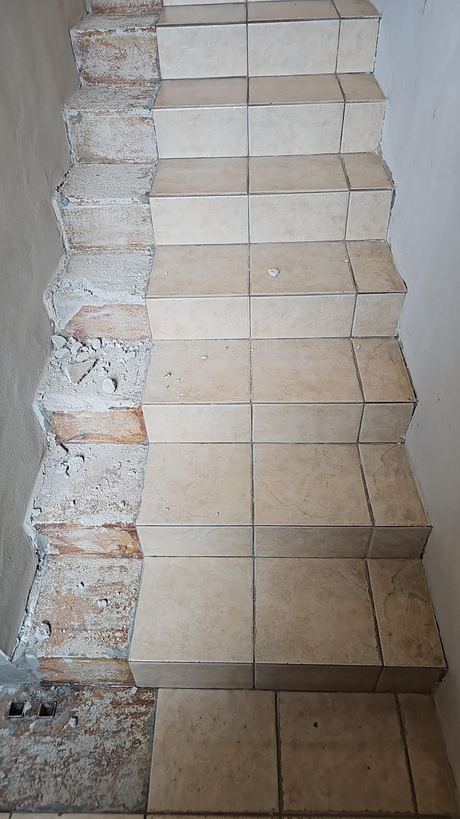 Ukázka práce podlahářů z BUKOMY. Betonové schodiště s původními keramickými obklady jsme obložili vinylovou podlahou s ohyby BUKOMA STONE U‑CLICK XL Beton Kámen Šedohnědý. Bílé podstupnice jsou z BUKOMA StairWhite SPC 4.0 a celek je dotažen soklovými lištami BUKOMA PROFI‑60 v dekoru podlahy. Výsledkem jsou schody s čistou bílou podstupnicí a moderním minerálním vzhledem nášlapů.