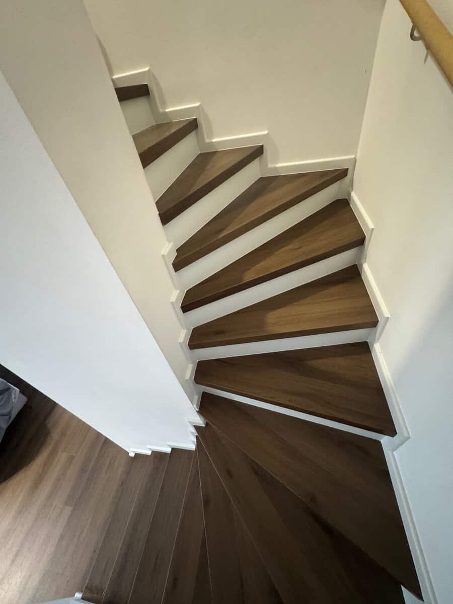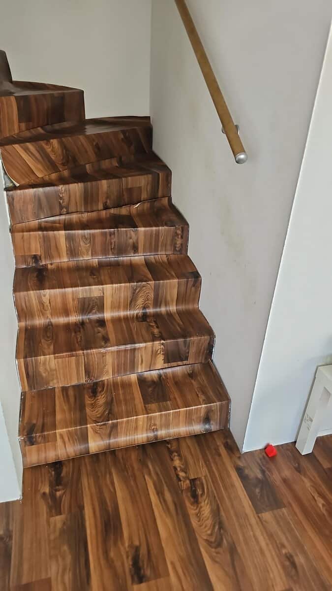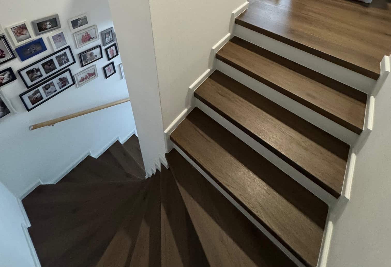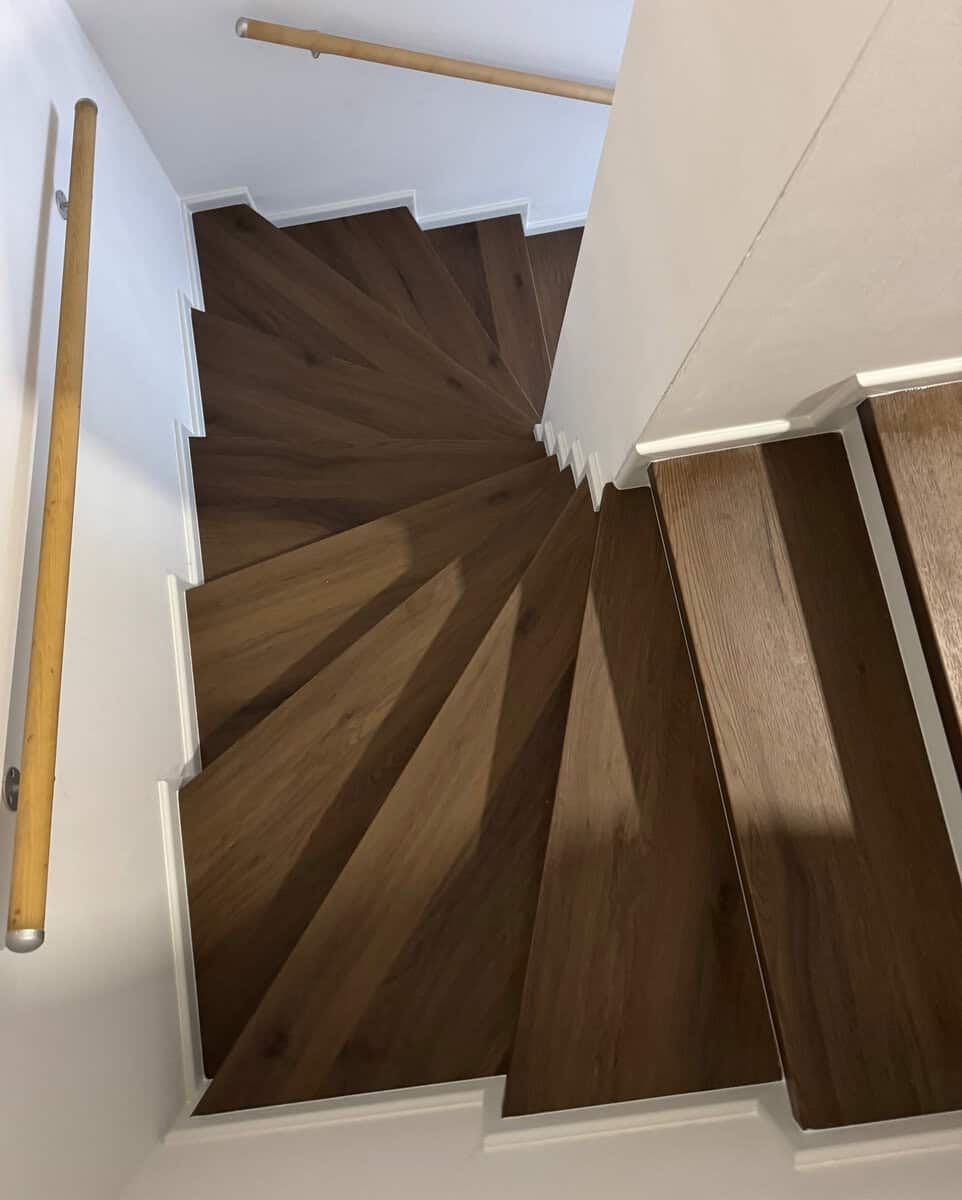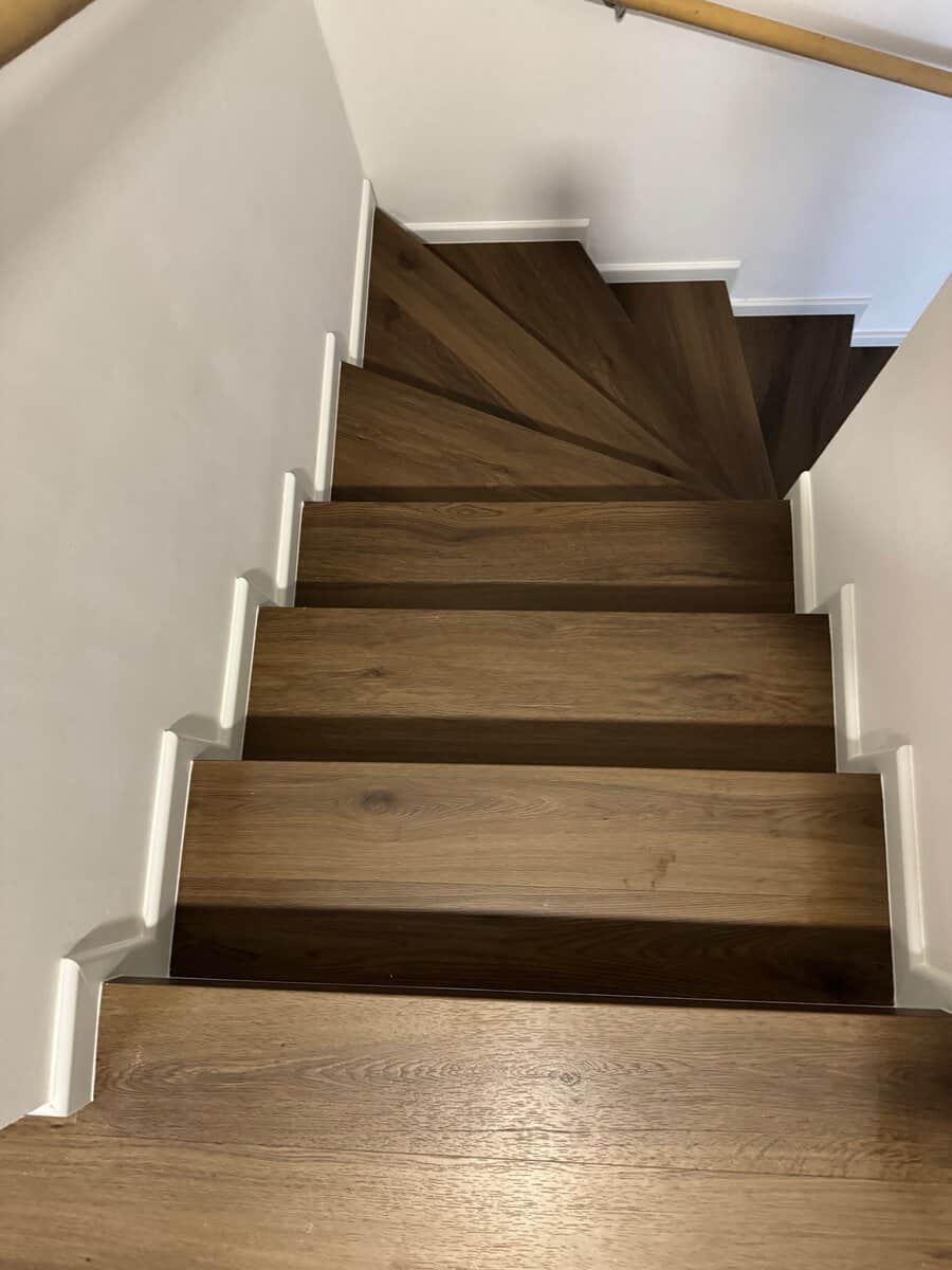 Podlaháři z BUKOMY v Kovalovicích (Jižní Morava). Teracové schodiště jsme obložili vinylovou podlahou s nosem a bílou podstupnicí BUKOMA PREMIUM U‑CLICK Dub Calvados, doplněno o soklové lišty BUKOMA PROFI‑60 v bílé barvě.