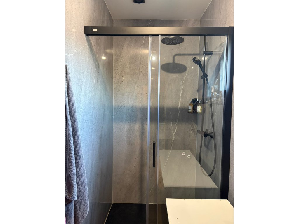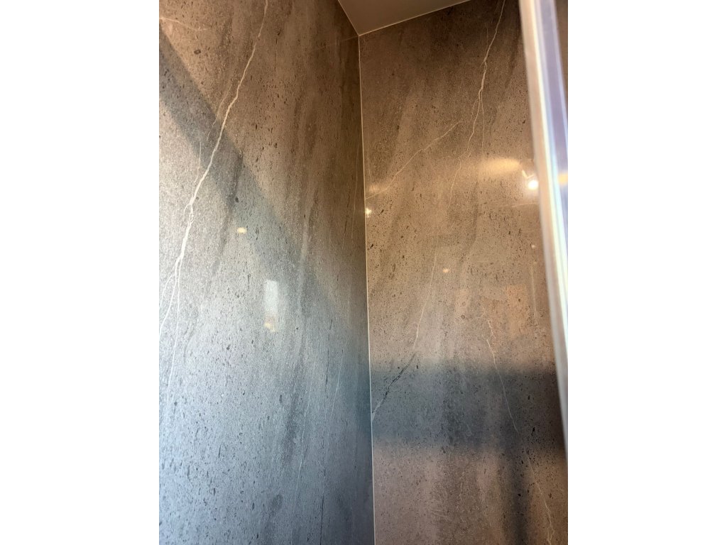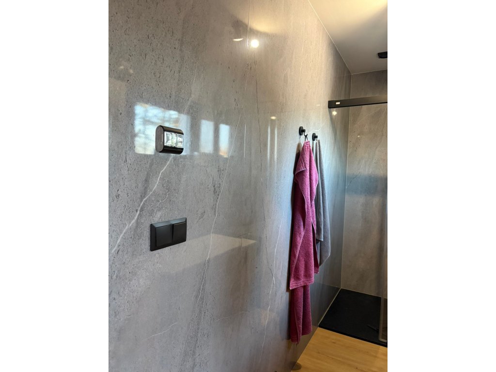 Skvěle funguje s černými doplňky, betonovou podlahou nebo dřevem. Díky velkoformátu působí prostorově klidně a soudržně.