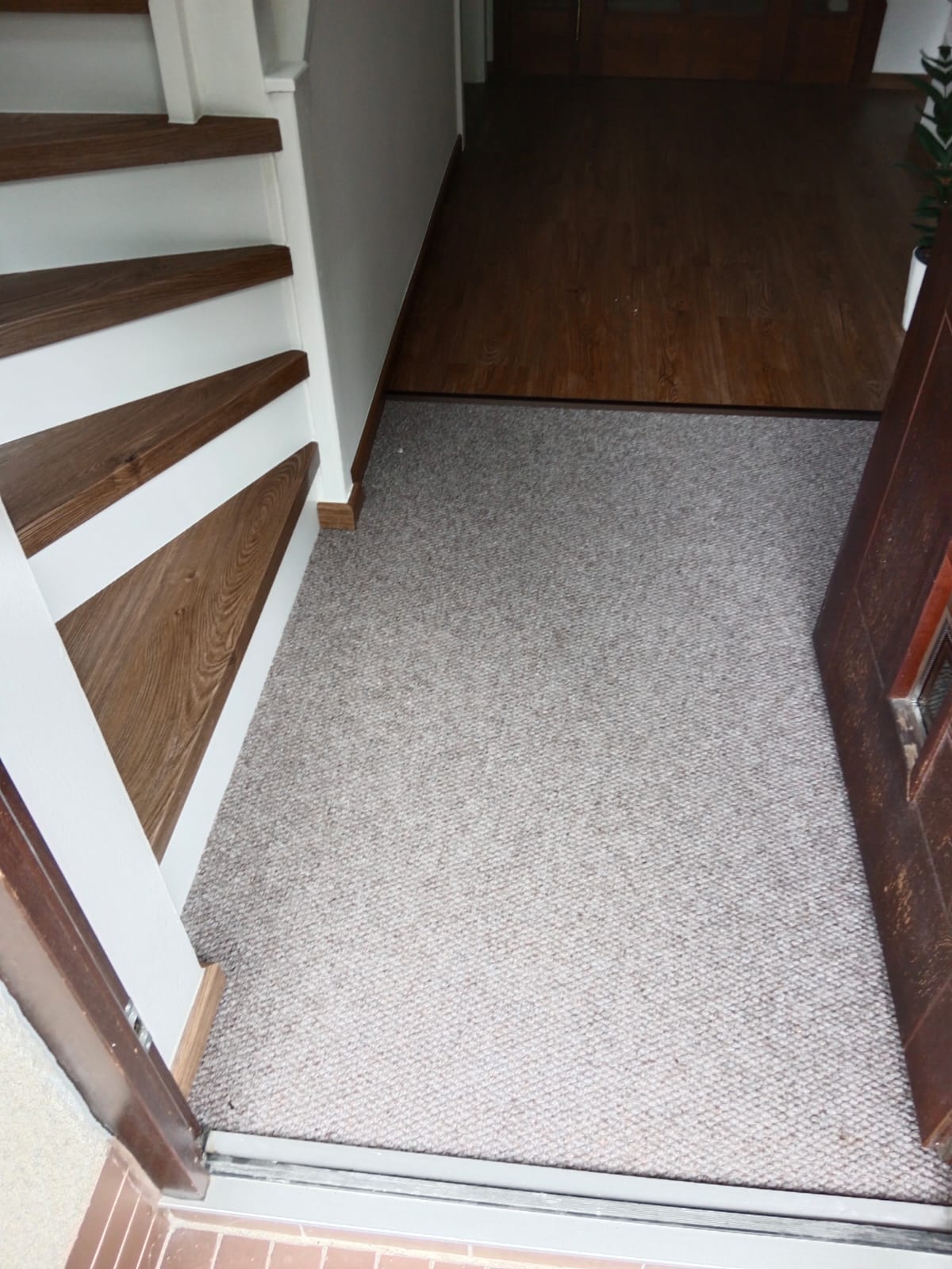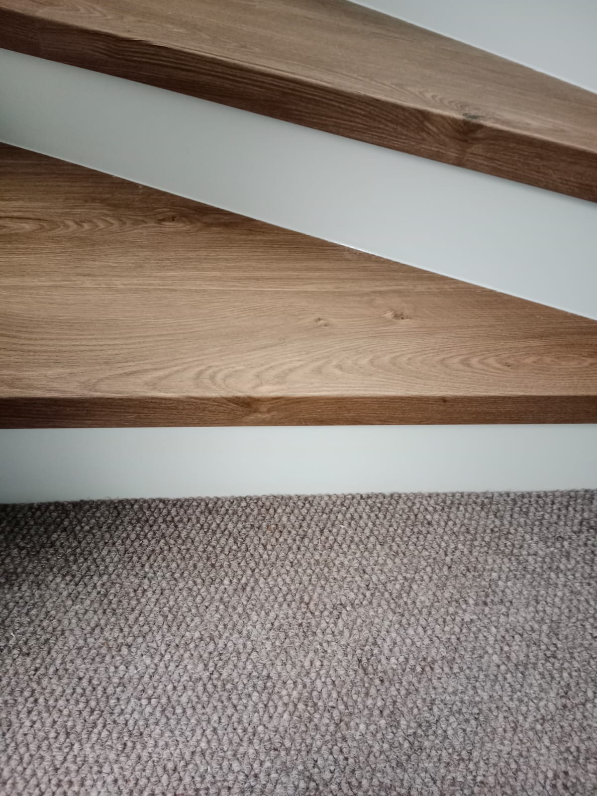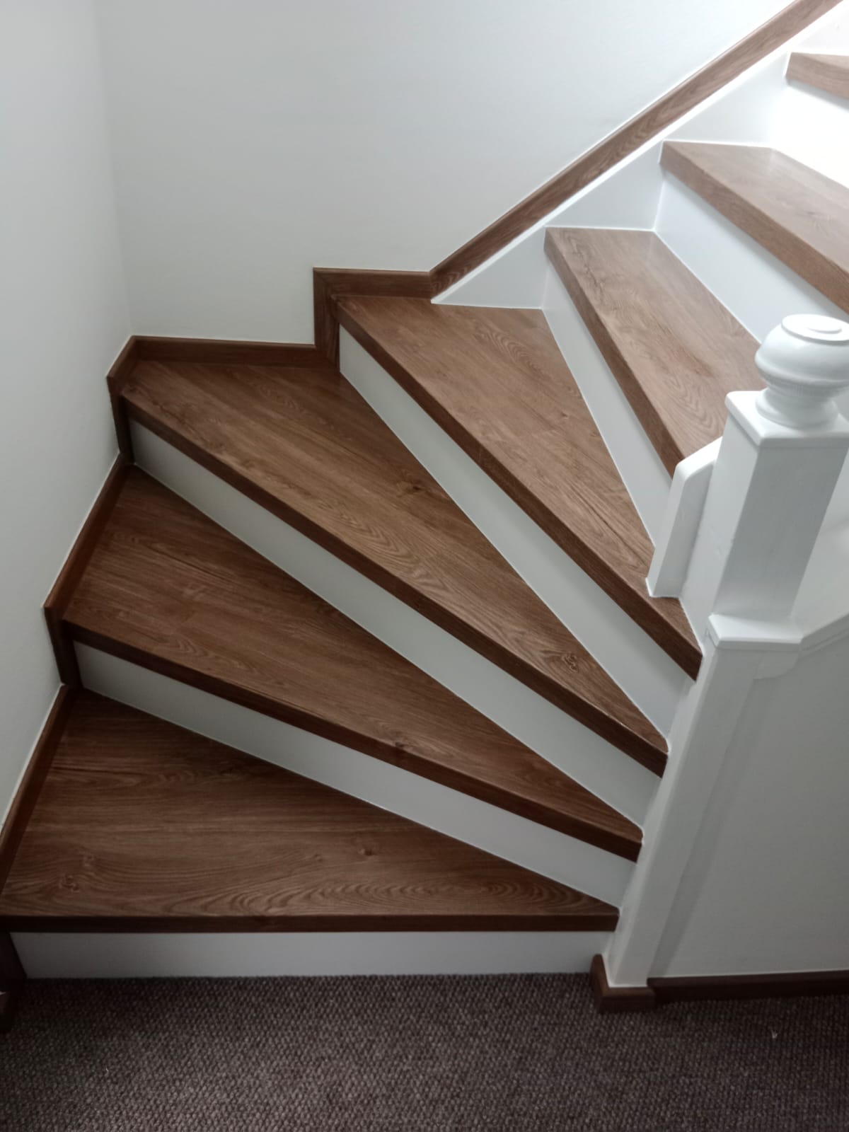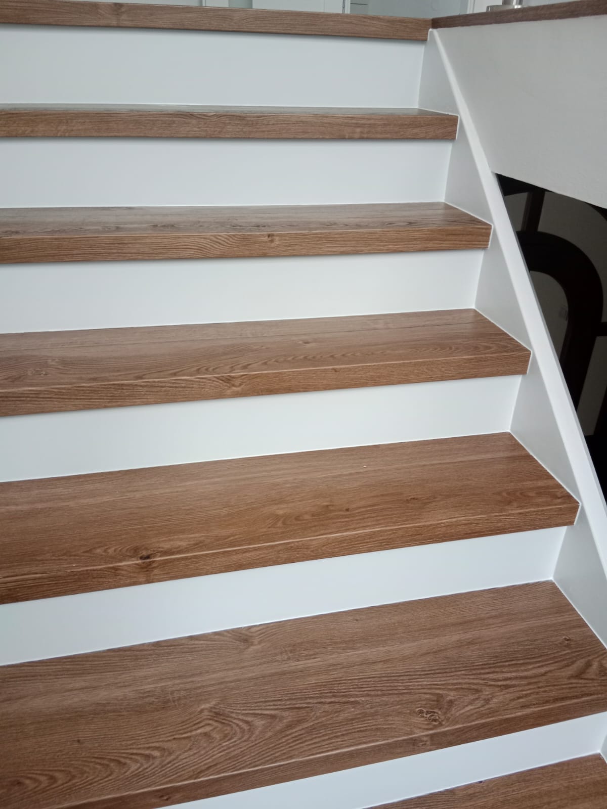V rodinném domě v Ledči nad Sázavou jsme se podíleli na proměně designu celého domu, pomohli jsme s podlahami, obkladem schodiště i koupelny s toaletou do vinylu BUKOMA. Zákazník si vybral podlahu v dekoru BUKOMA PREMIUM U‑CLICK Dub Všechovický, který přináší autentickou kresbu dubu a odolný povrch pro každodenní provoz. Schodiště je realizováno se schody s nosem pro bezpečný došlap a čisté linie. Zakončení stěn zajišťují soklové lišty BUKOMA PROFI‑60 v přesném dekoru podlahy, díky čemuž je prostor vizuálně kompaktní a působí jednotně. Pro obklady zdí v koupelně a toaletě pak byla zvolena vinylová podlaha v dekoru BUKOMA STONE U-CLICK XL Beton Kámen Šedý