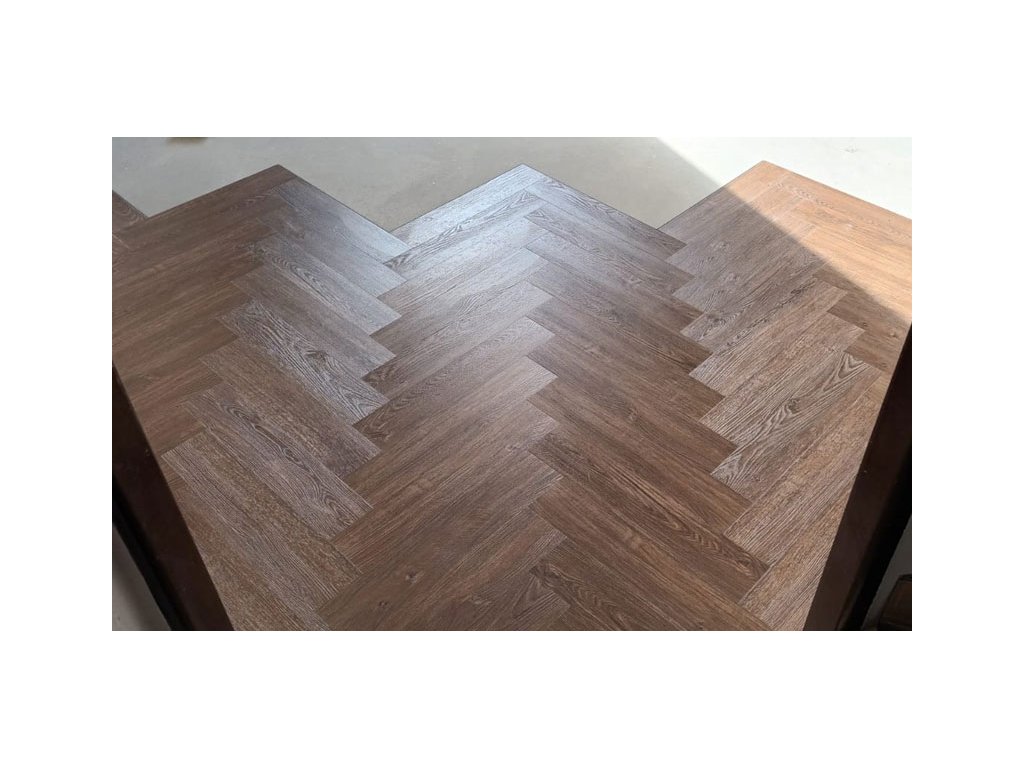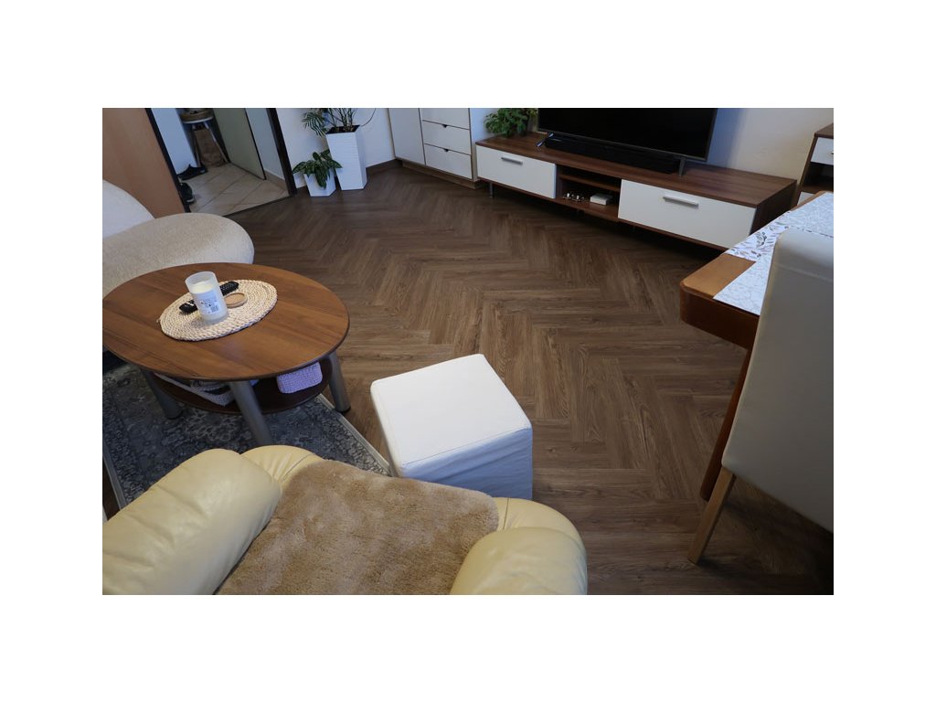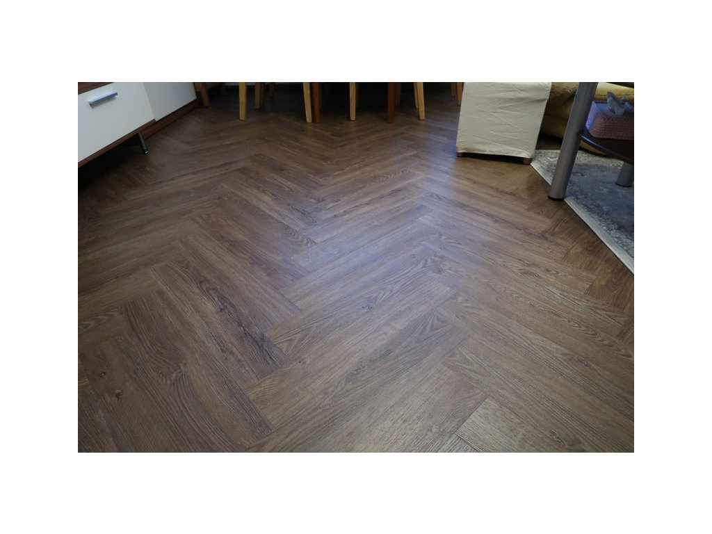 Vinylová plovoucí podlaha BUKOMA HERRINGBONE U‑CLICK s integrovanou podložkou IXPE 1,5 mm v dekoru Dub Všechovický věrně imituje dřevěné parkety pokládané do stromečku. Registrovaný emboss a středně tmavý dubový tón podtrhují luxusní vzhled pro moderní i klasické interiéry.