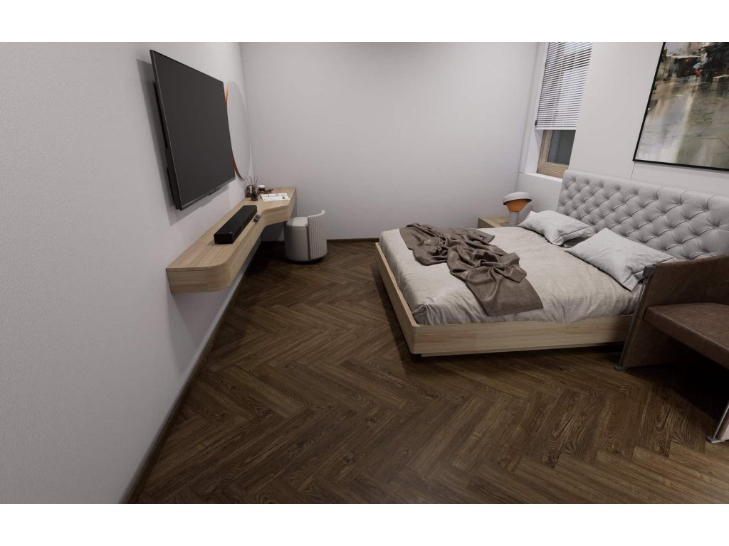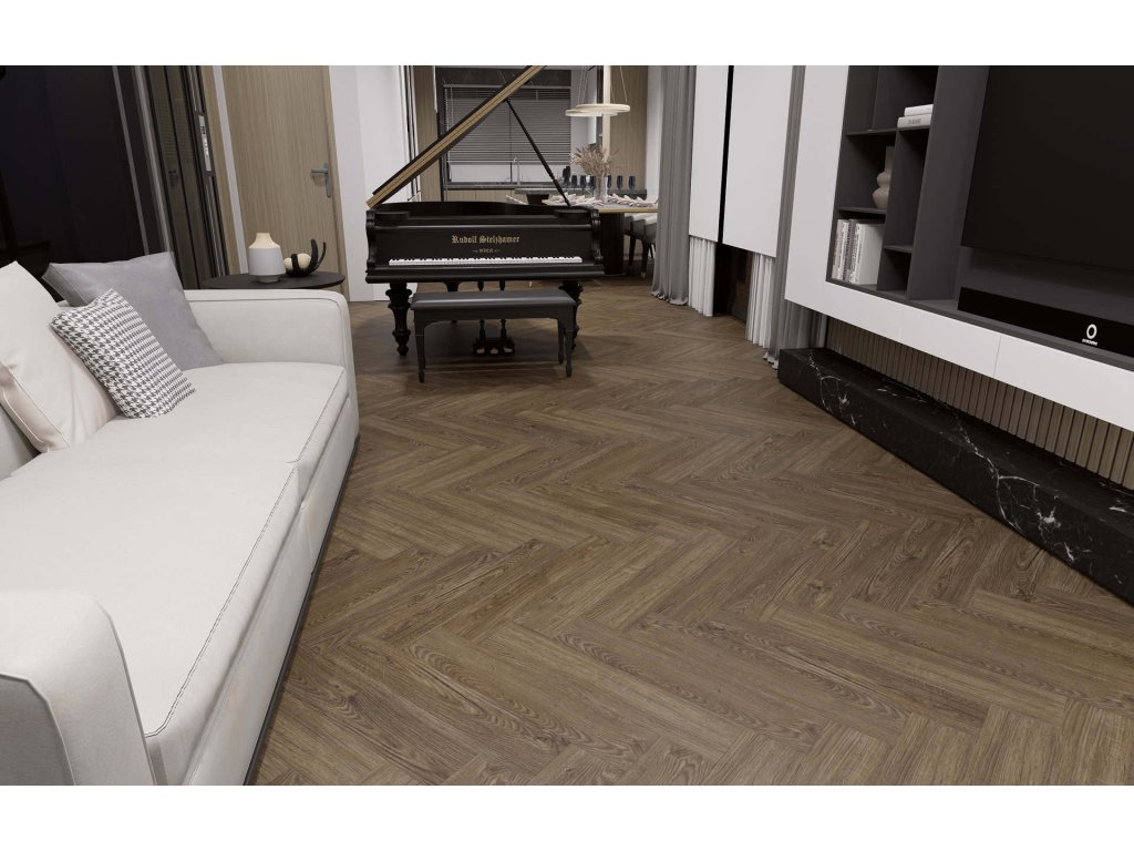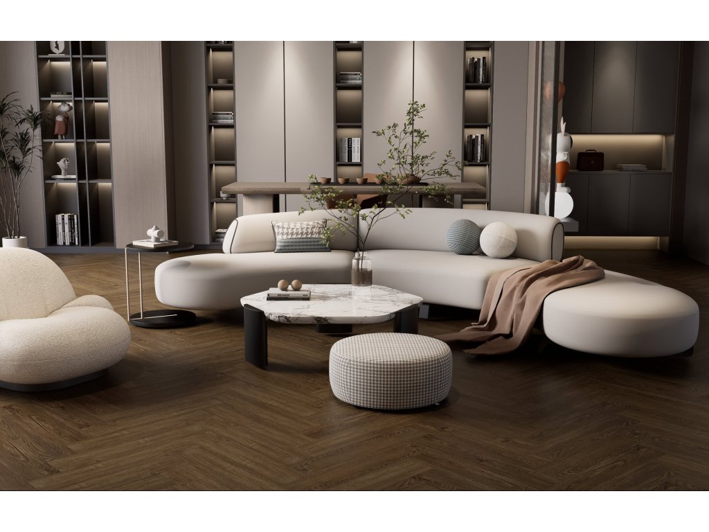 Vinylová plovoucí podlaha BUKOMA HERRINGBONE U-CLICK s integrovanou podložkou v dekoru Dub Všechovický zaujme sytějším, tmavším tónem dubu a výraznější kresbou dřeva, která dodává interiéru hloubku, charakter a pocit poctivého řemesla. Pokládka do stromečku podtrhuje elegantní rytmus podlahy a působí luxusně zejména ve větších prostorech. Registrovaný emboss a jemná mikro V-drážka zvýrazňují realistický vzhled dřeva, zatímco odolný vinylový povrch zajišťuje komfortní a bezstarostné používání. Ideální volba pro interiéry, kde má podlaha hrát hlavní roli.