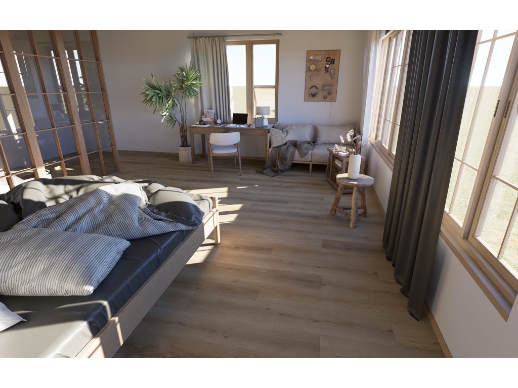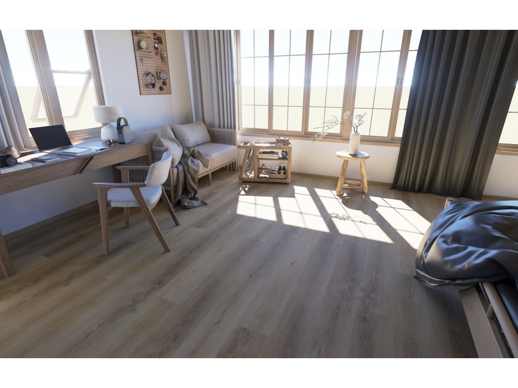 V interiéru funguje výborně jako univerzální základ: snadno ho sladíte se světlým i tmavším nábytkem, hodí se k bílé, béžové i šedým doplňkům a dobře zapadne do moderních i klasických prostor. Kartáčovaný vzhled a registrovaný emboss mu navíc dodávají realistický dojem dřeva i při pohledu zblízka.