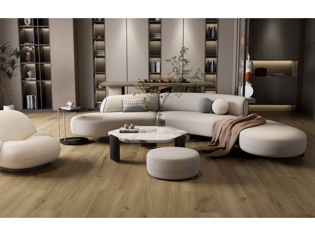 Dub Halifax Přírodní je rustikální, přitom vyvážený dekor se suky a jemnými prasklinami. Působí autenticky v moderních, skandinávských i industriálních interiérech, kde zútulní chladnější barevné palety.