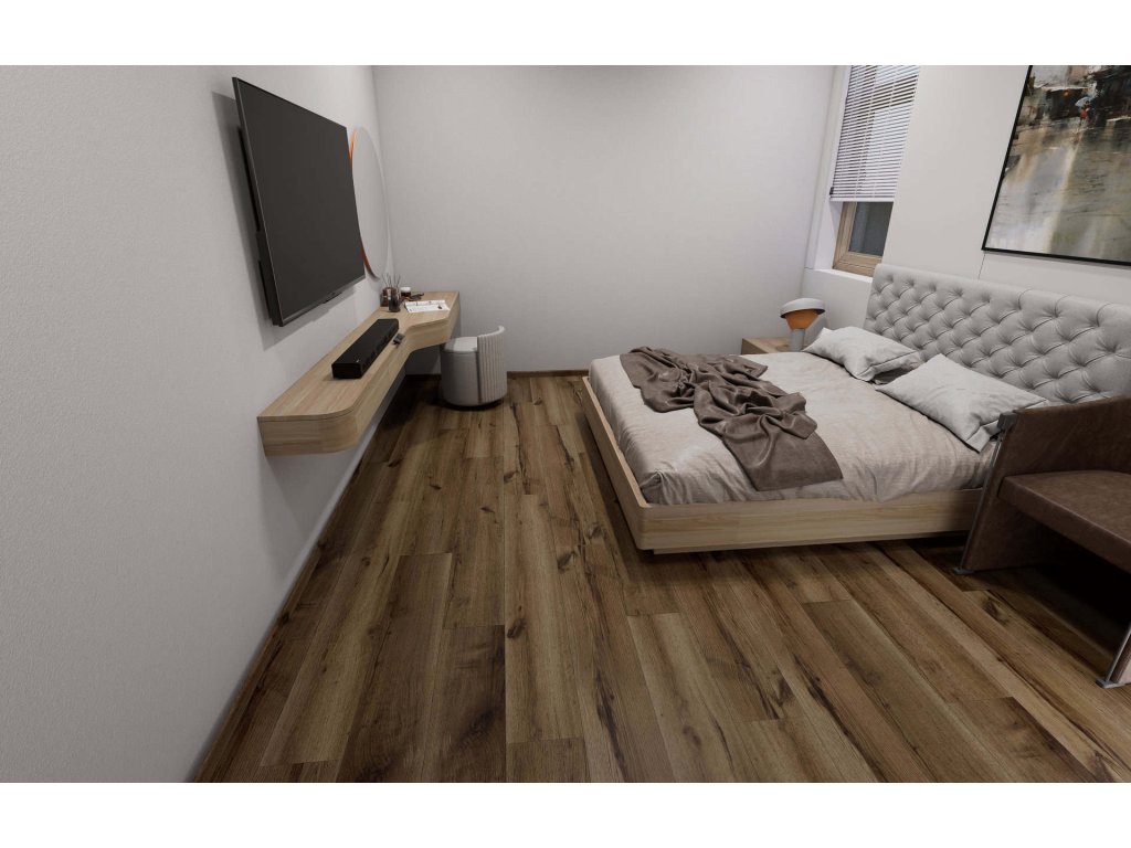 Vinylová plovoucí podlaha BUKOMA PREMIUM U‑CLICK XL s integrovanou korkovou podložkou 1 mm v dekoru Dub Halifax Tabákový přináší sytější, tabákově hnědý tón s výraznou kresbou, suky a jemnými „prasklinami“. Realistická textura s registrovaným embossem působí přirozeně a teple. Dekor skvěle ladí se stolovými deskami a nábytkem ve vzoru Egger H1181, snadno jej zkombinujete i s čistě bílou, světle šedou, béžovou či s prvky kovu, skla a kamene.