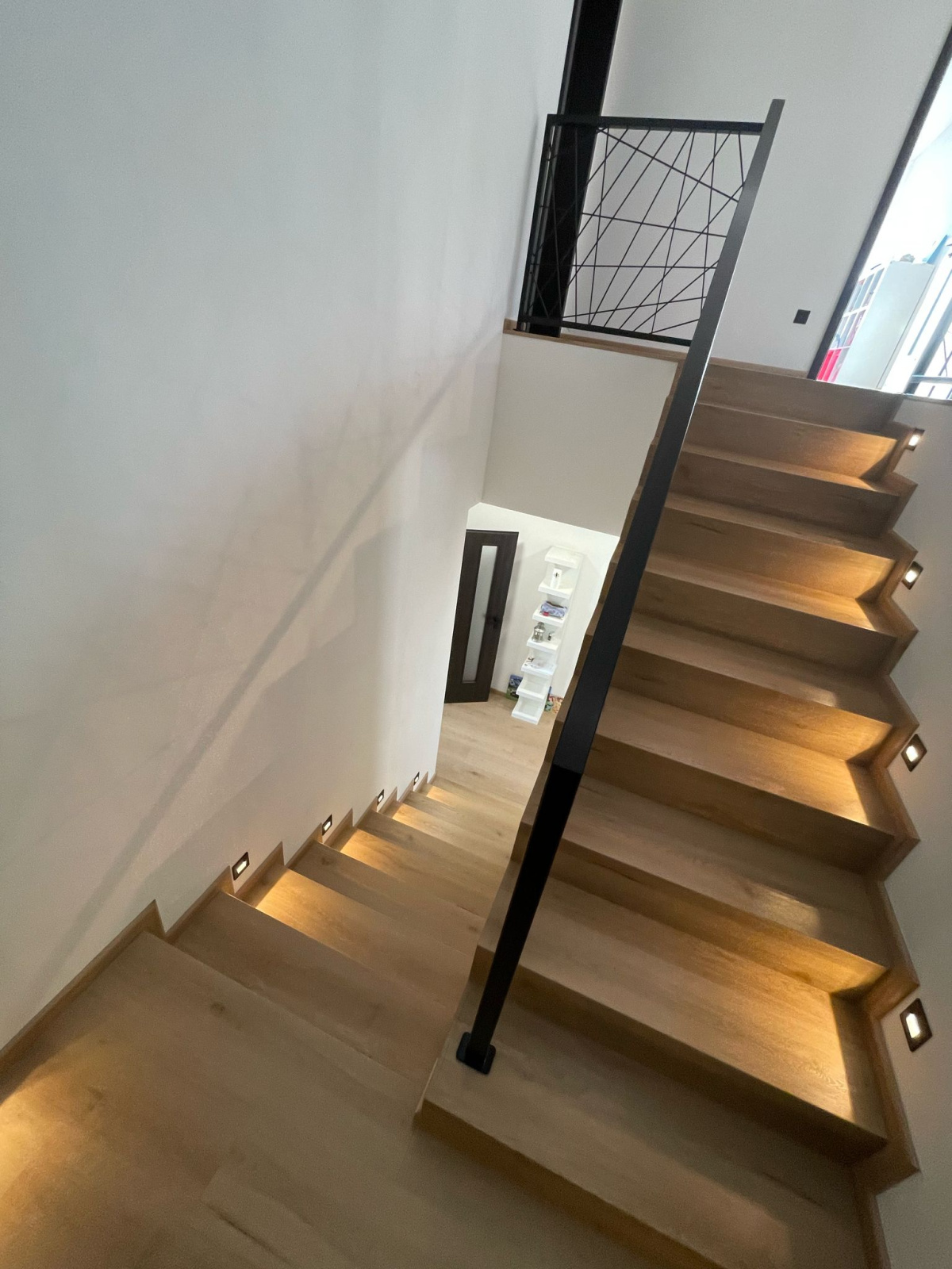Součástí této realizace byl také obklad betonového monolitického schodiště stejným dekorem vinylu, konkrétně BUKOMA 3D TEX U-CLICK Dub Natur. Na přání zákazníka bylo schodiště provedeno bez nosu, což dodalo schodům minimalistický a elegantní vzhled. Precizně provedené ohyby zajišťují dokonalý vizuální dojem a zároveň maximální bezpečnost při používání schodiště.