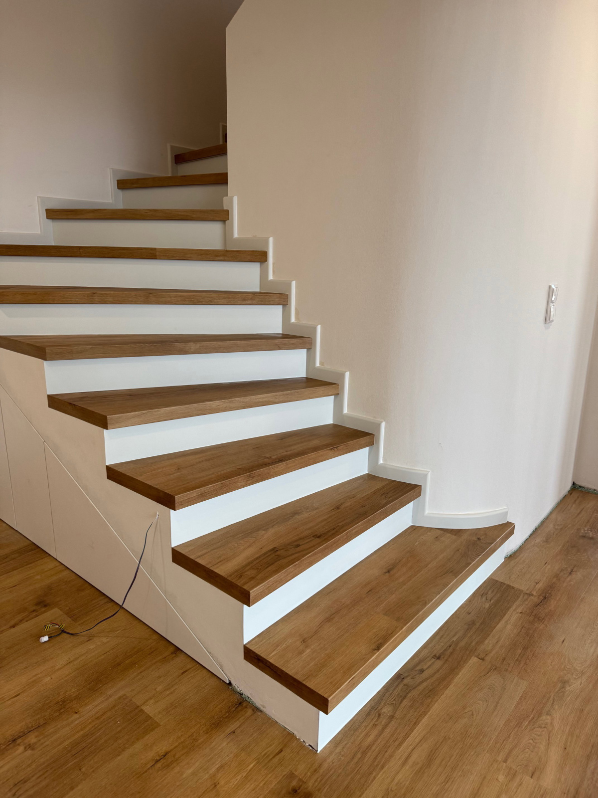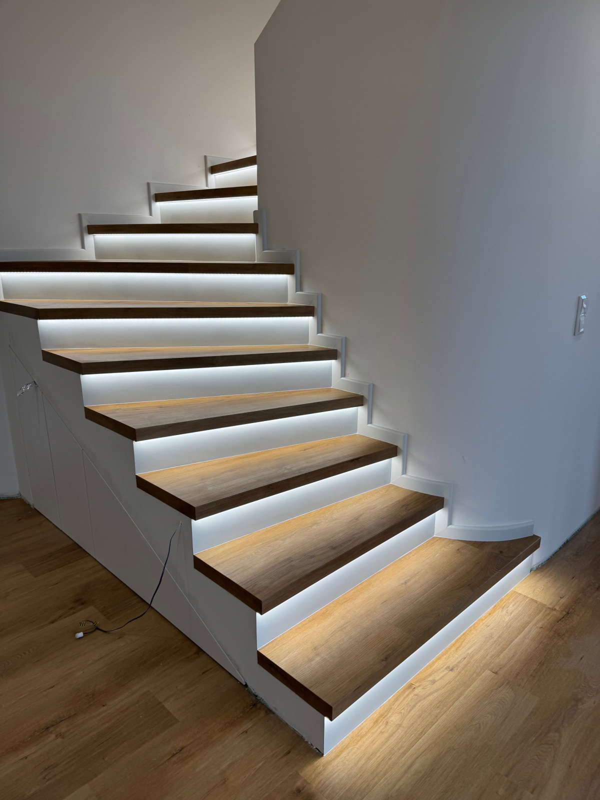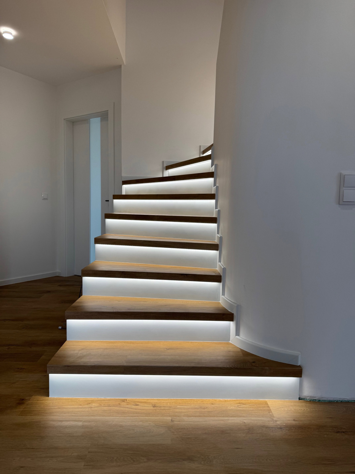 Moderní schodiště může být víc než jen funkční prvek. V této realizaci ve Veselí nad Moravou jsme původní betonové schody proměnili v elegantní dominantu interiéru – vinylový obklad s nosem, bílá podstupnice a integrované LED osvětlení vytvářejí čistý, vzdušný a nadčasový vzhled. Celek jsme doplnili o bílé soklové lišty BUKOMA PROFI-60, které schodiště opticky uzavírají a podtrhují jeho precizní zpracování.