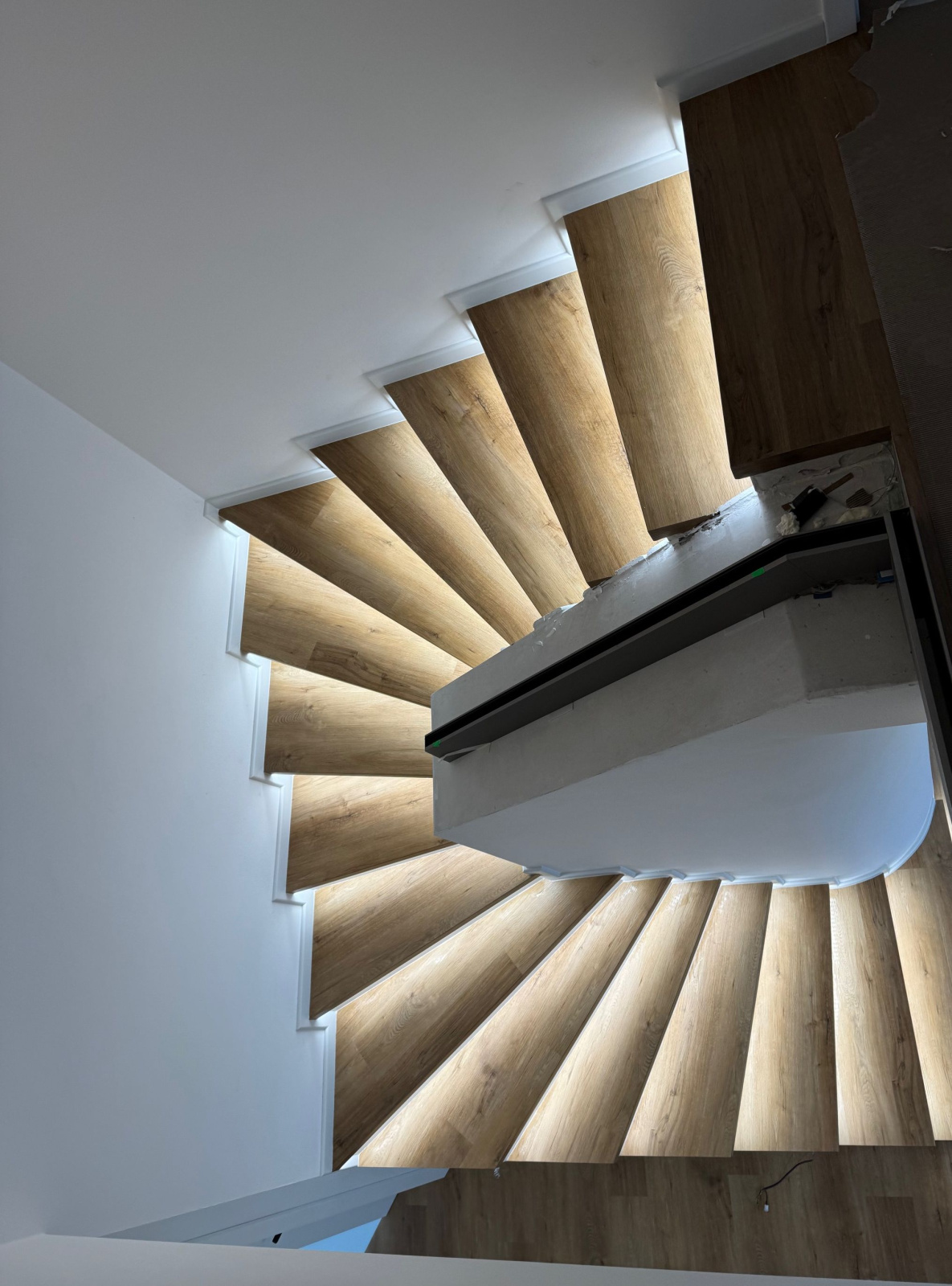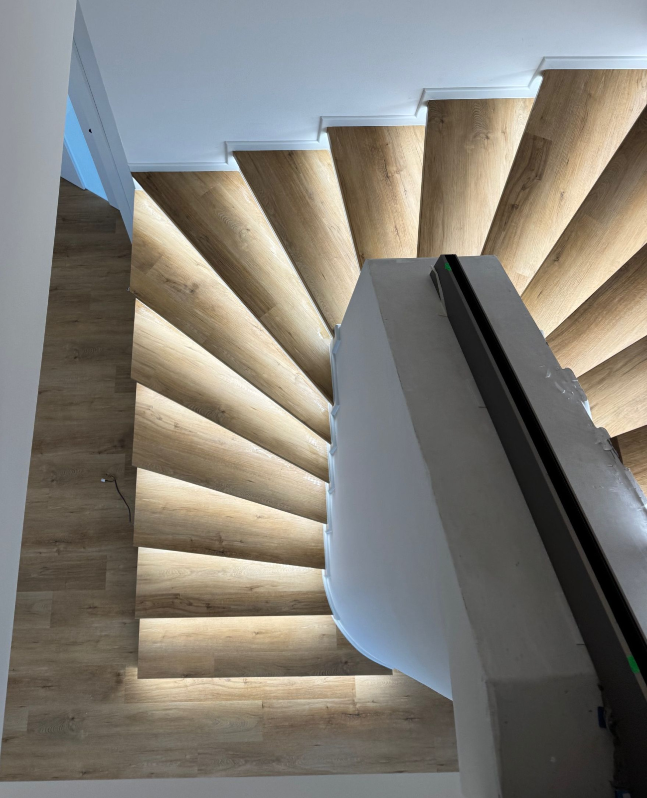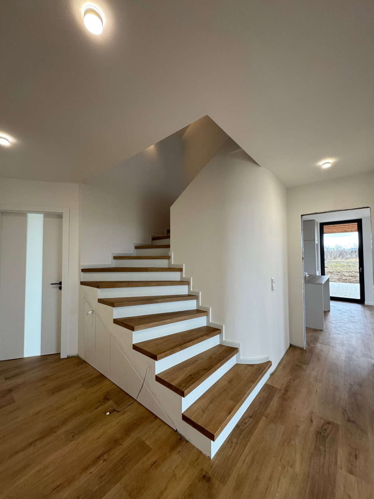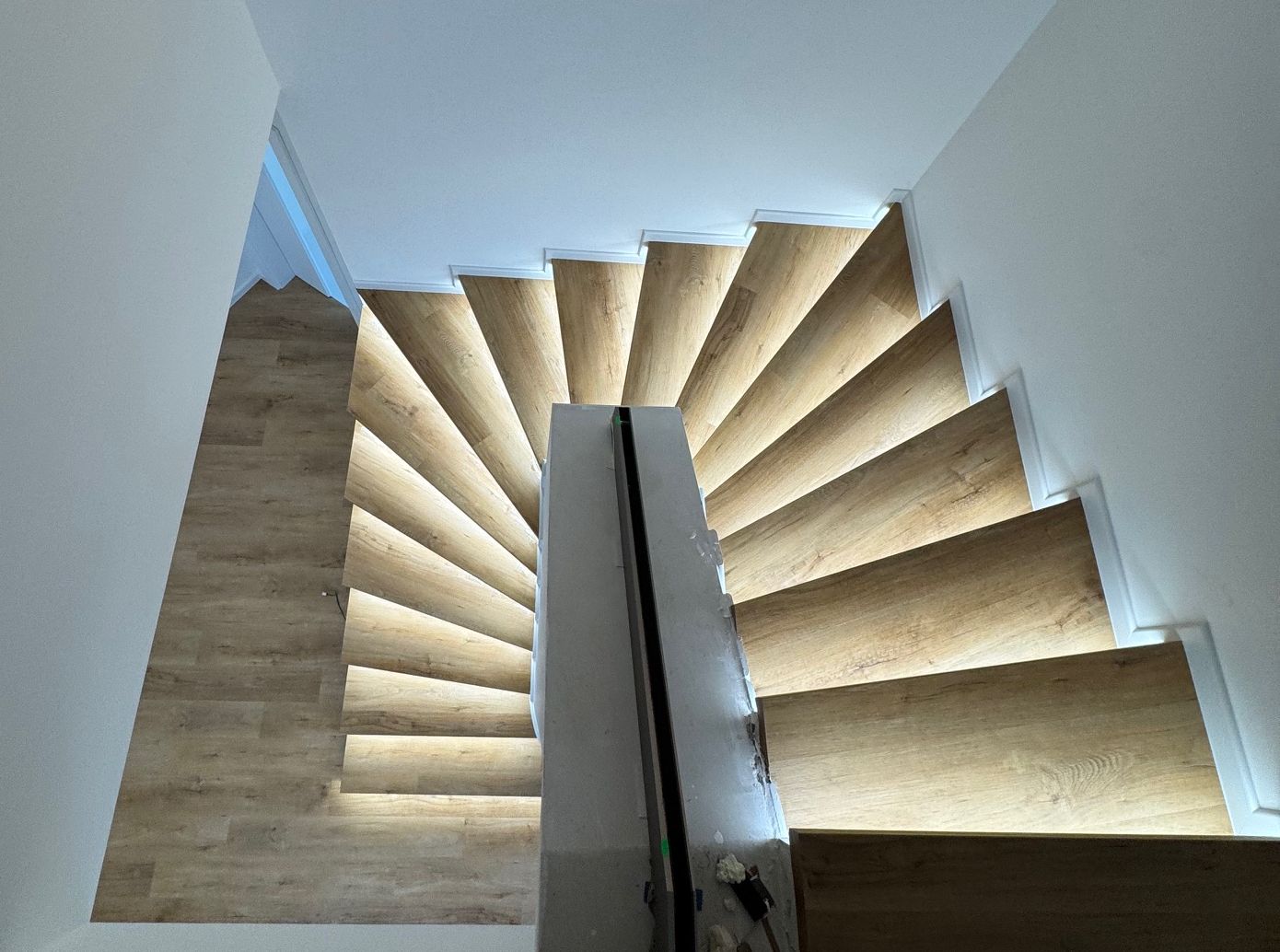 Moderní schodiště může být víc než jen funkční prvek. V této realizaci ve Veselí nad Moravou jsme původní betonové schody proměnili v elegantní dominantu interiéru – vinylový obklad s nosem, bílá podstupnice a integrované LED osvětlení vytvářejí čistý, vzdušný a nadčasový vzhled. Celek jsme doplnili o bílé soklové lišty BUKOMA PROFI-60, které schodiště opticky uzavírají a podtrhují jeho precizní zpracování.