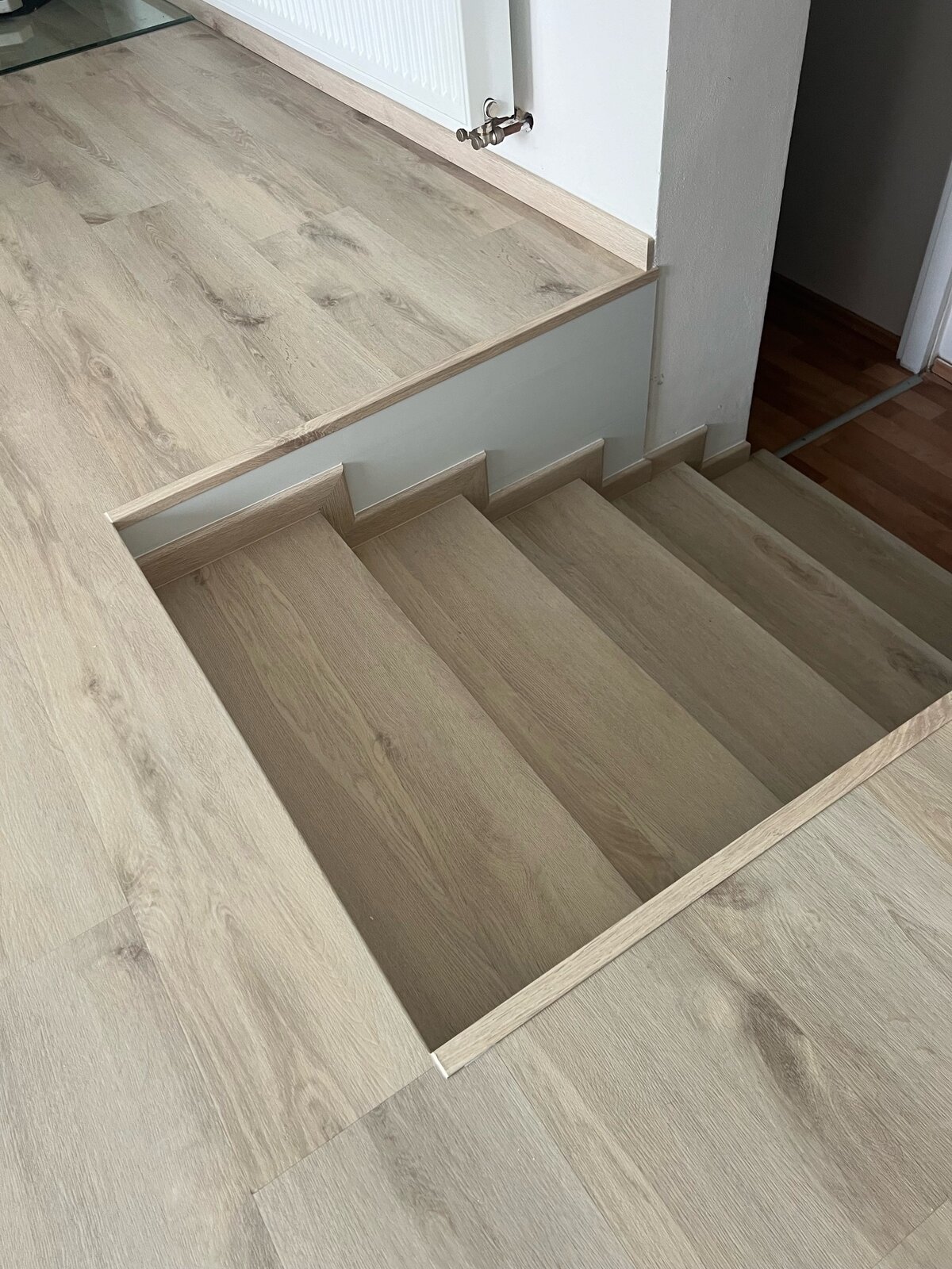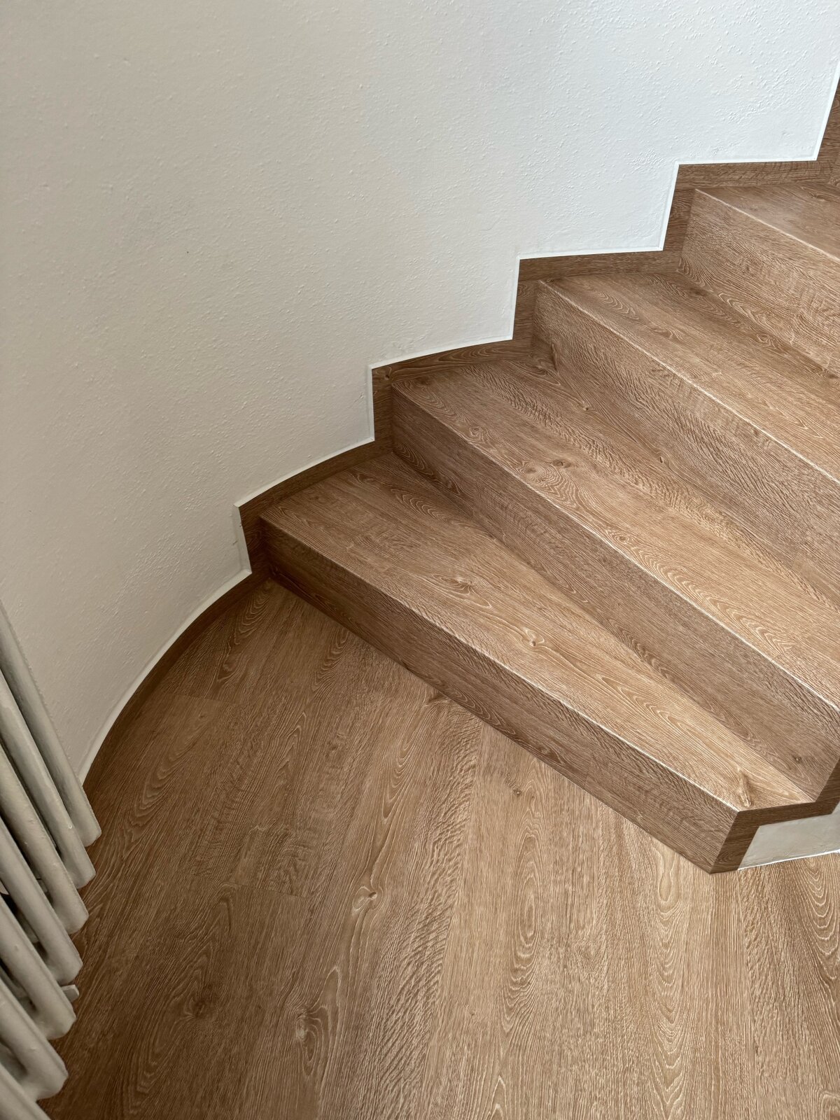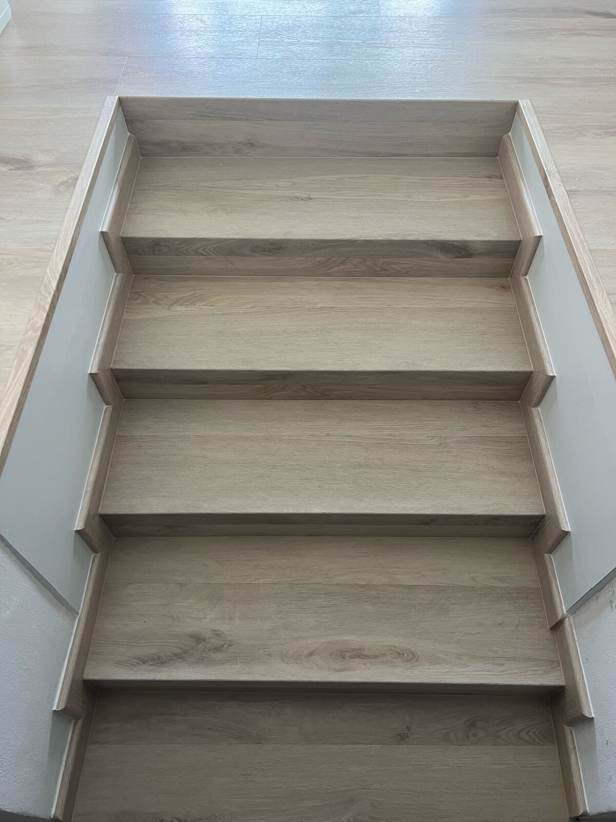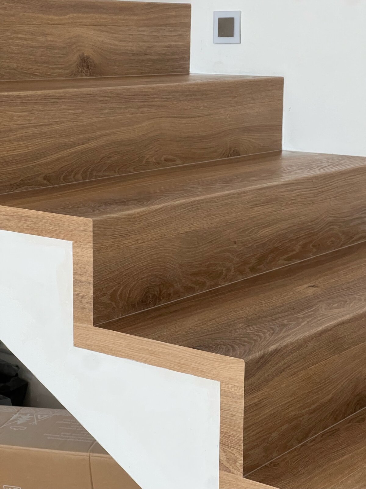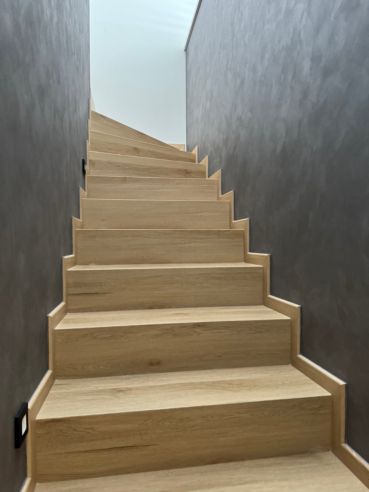 V této galerii najdete ukázky realizací vinylových schodů bez nosu provedených technologií BUKOMA®. Tento způsob obkladu poskytuje čistý, moderní vzhled a zvýrazňuje minimalistické linie interiéru.