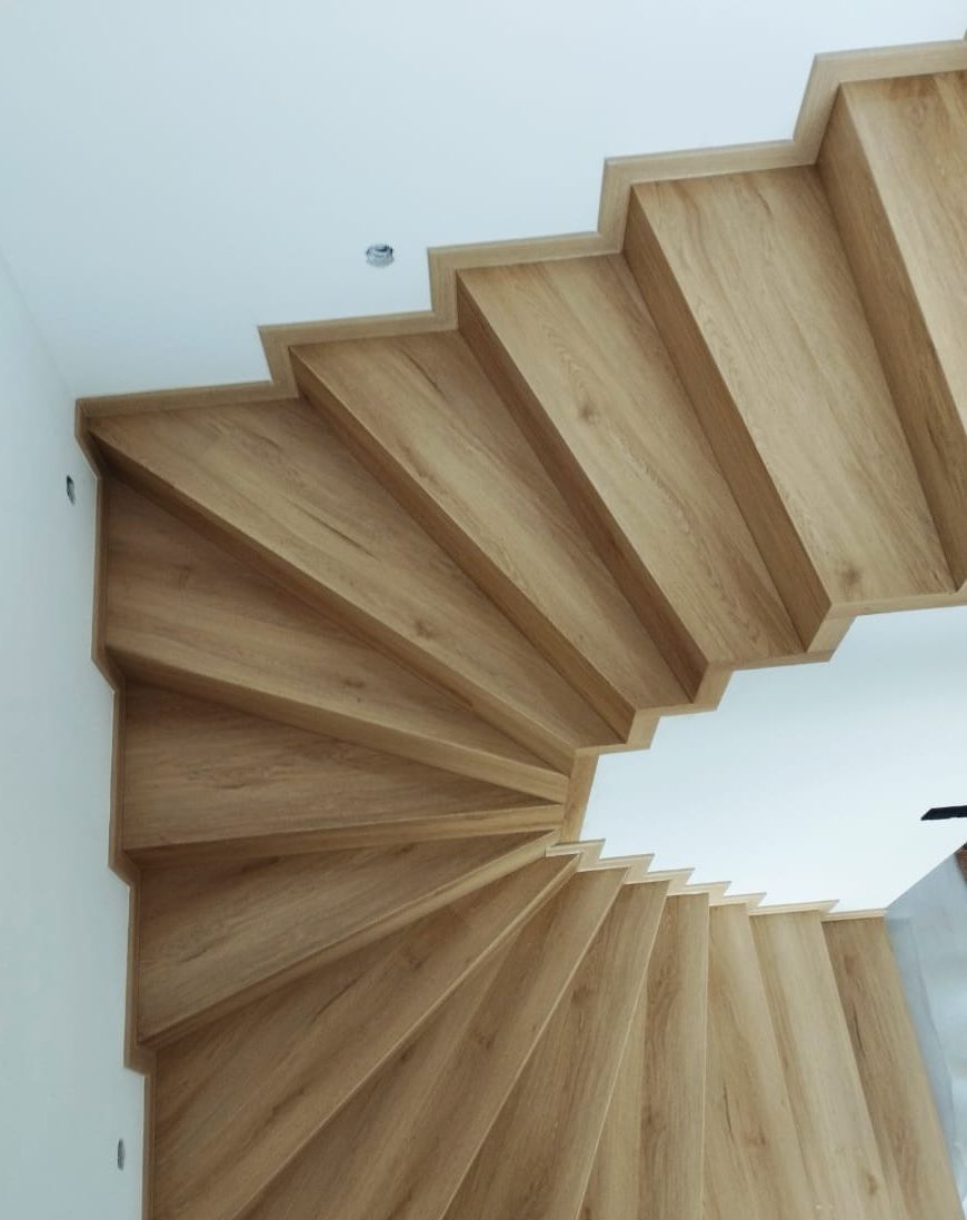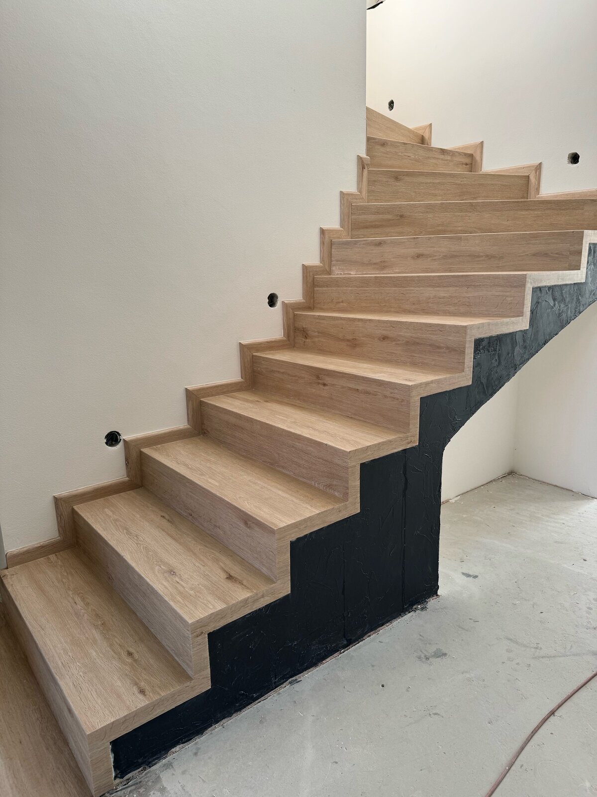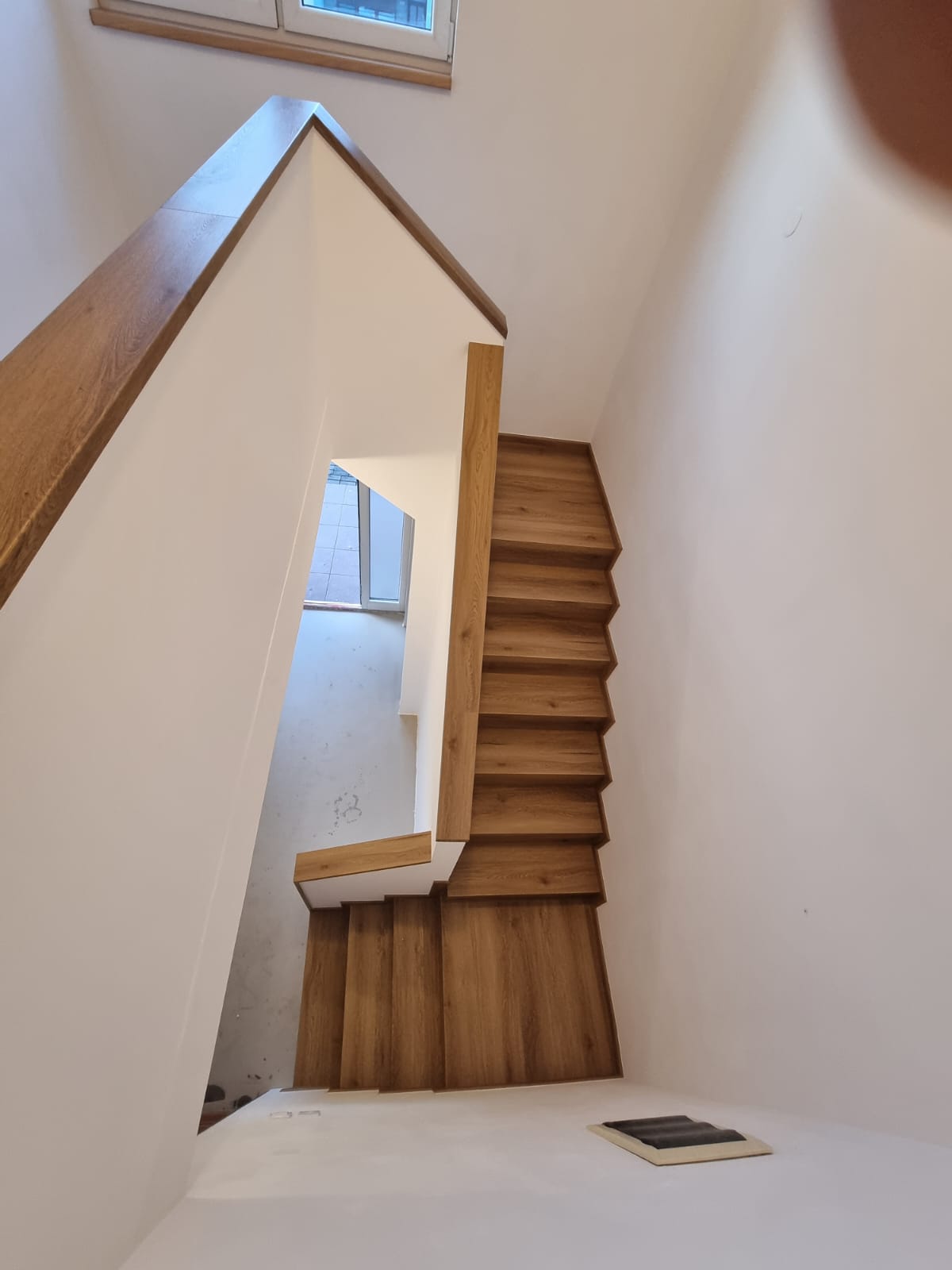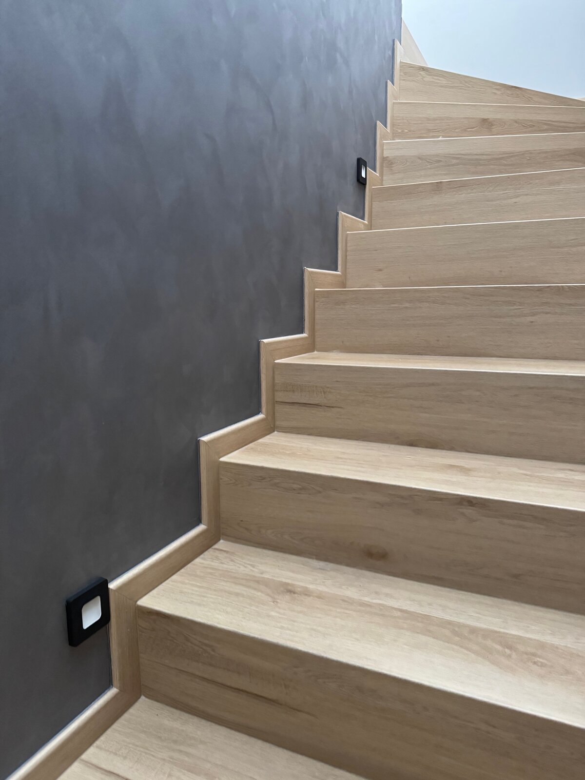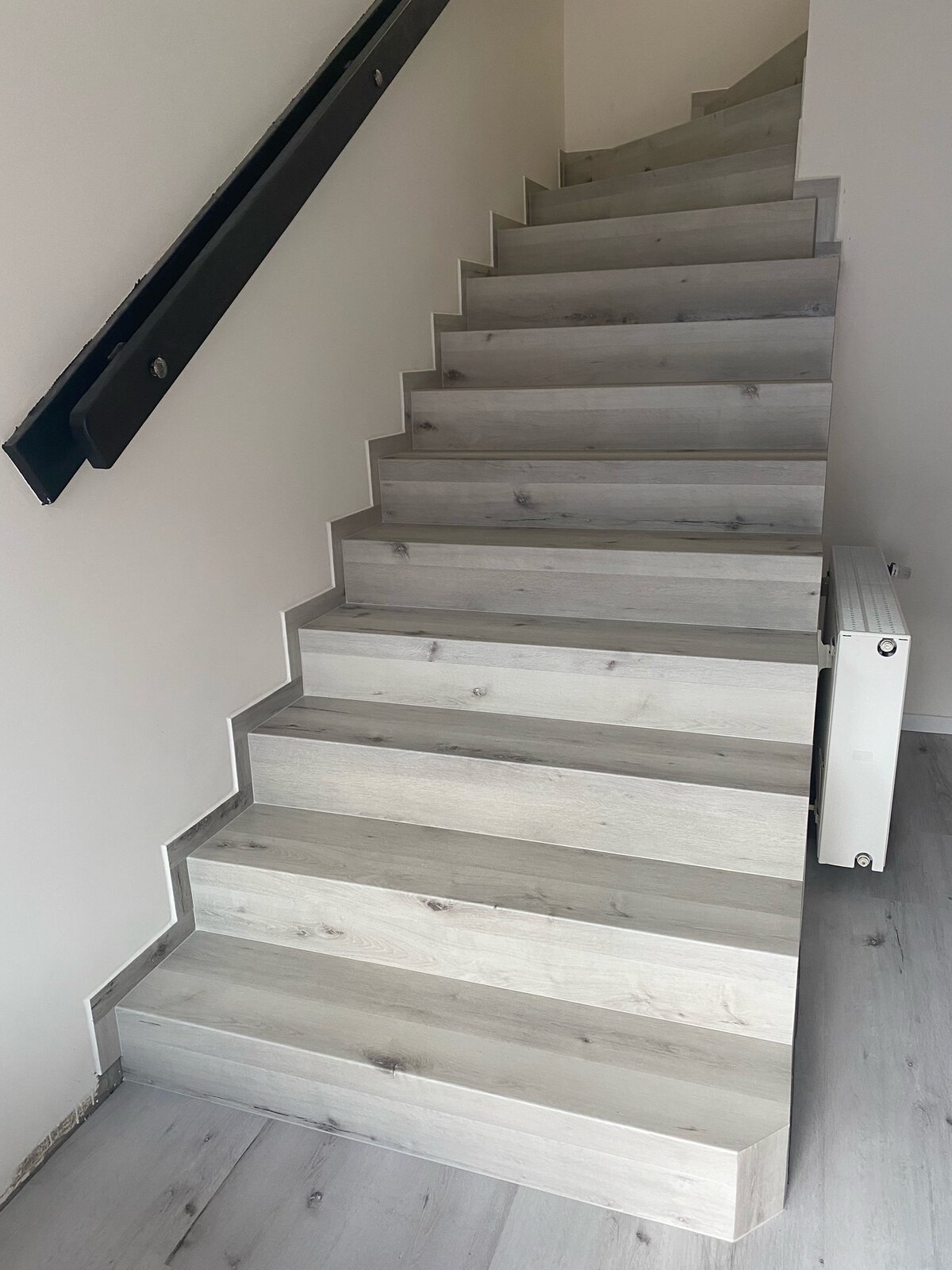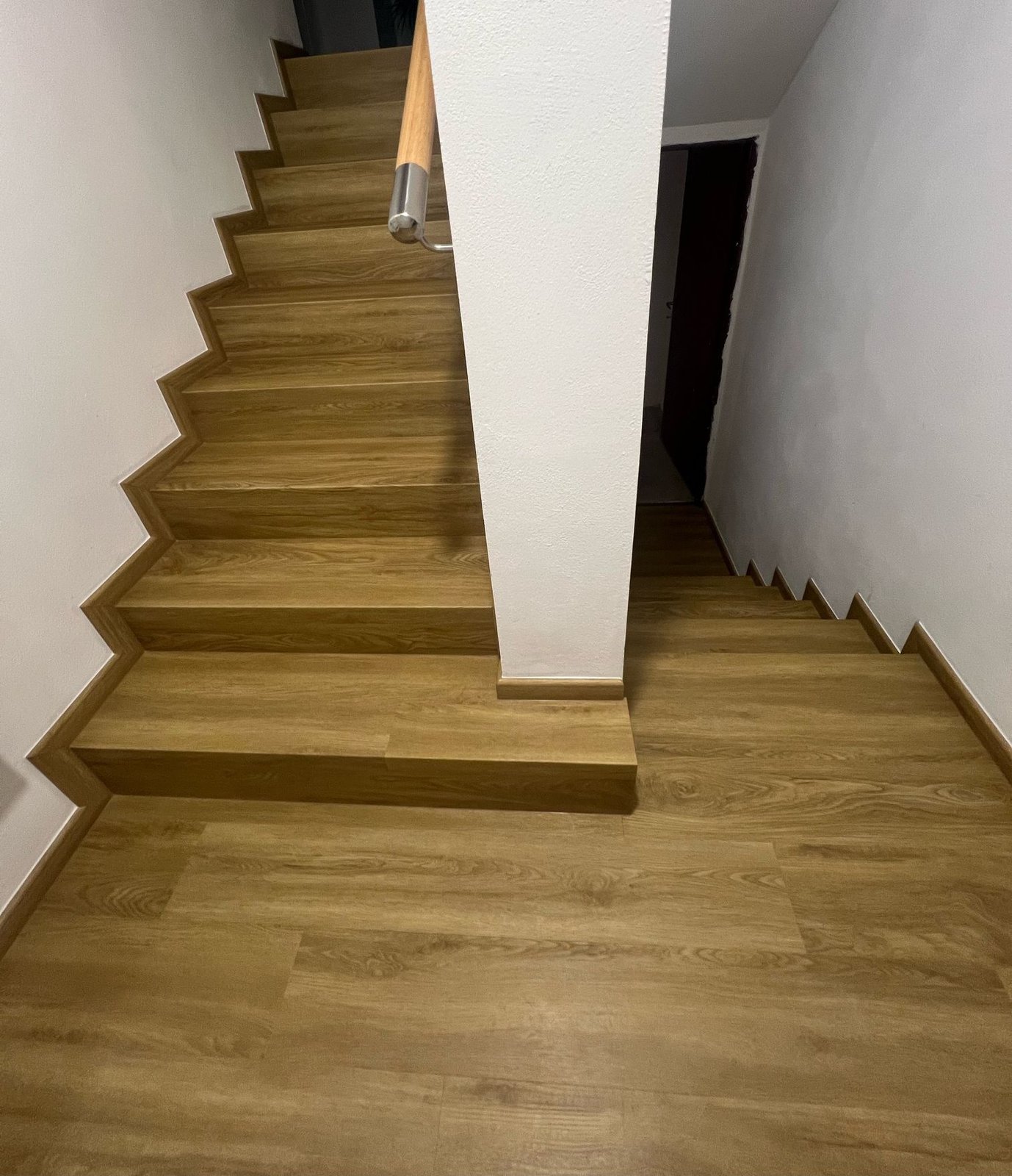 V této galerii najdete ukázky realizací vinylových schodů bez nosu provedených technologií BUKOMA®. Tento způsob obkladu poskytuje čistý, moderní vzhled a zvýrazňuje minimalistické linie interiéru.