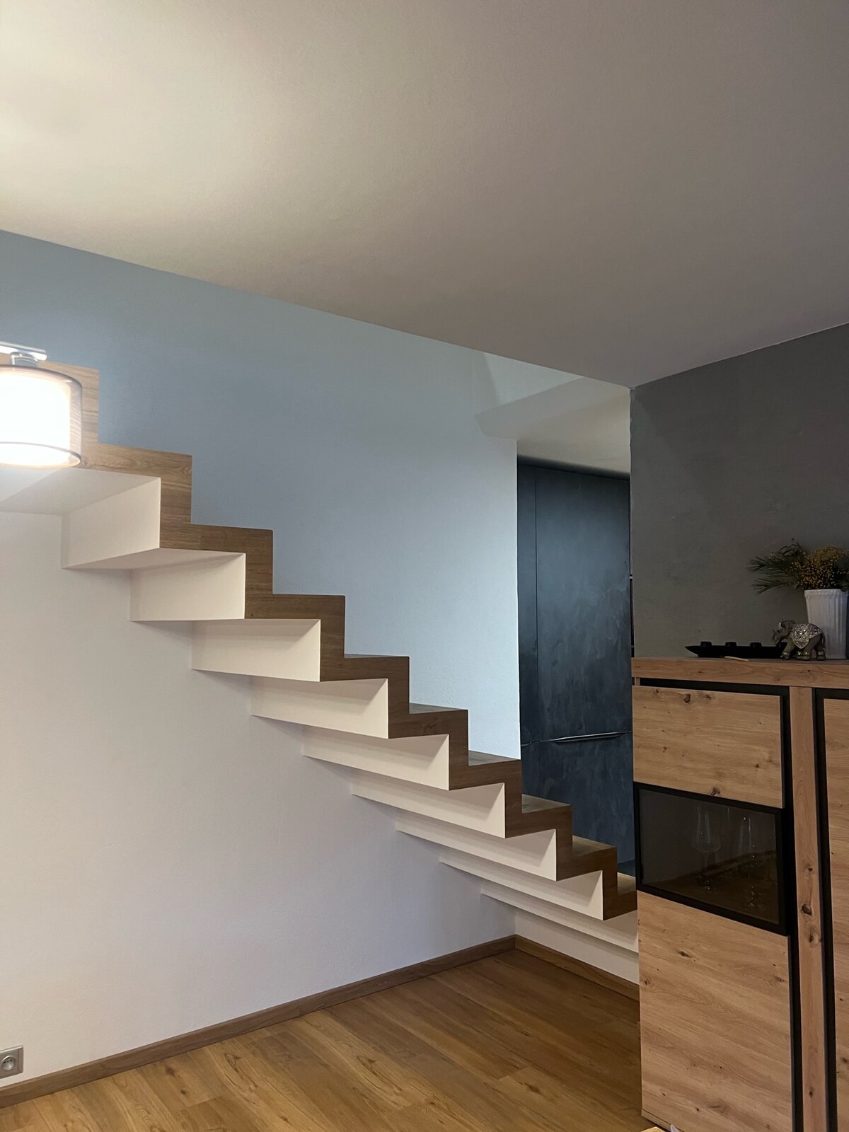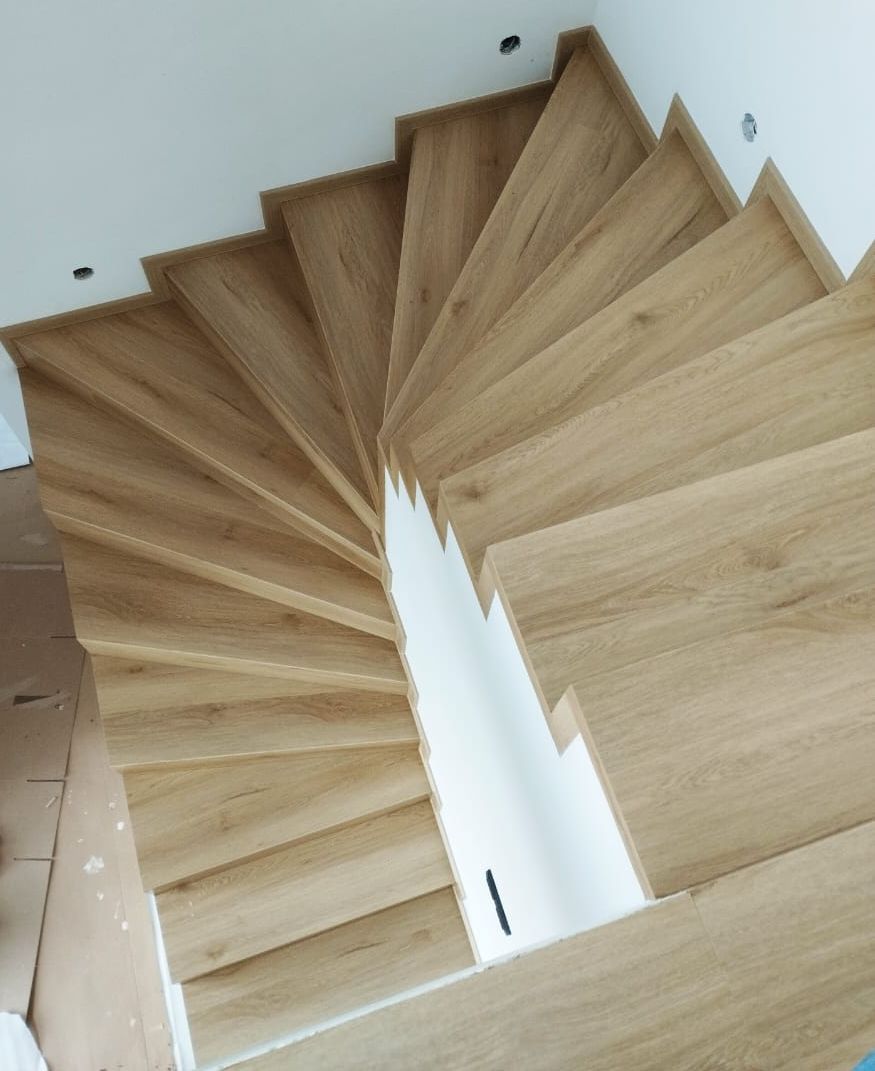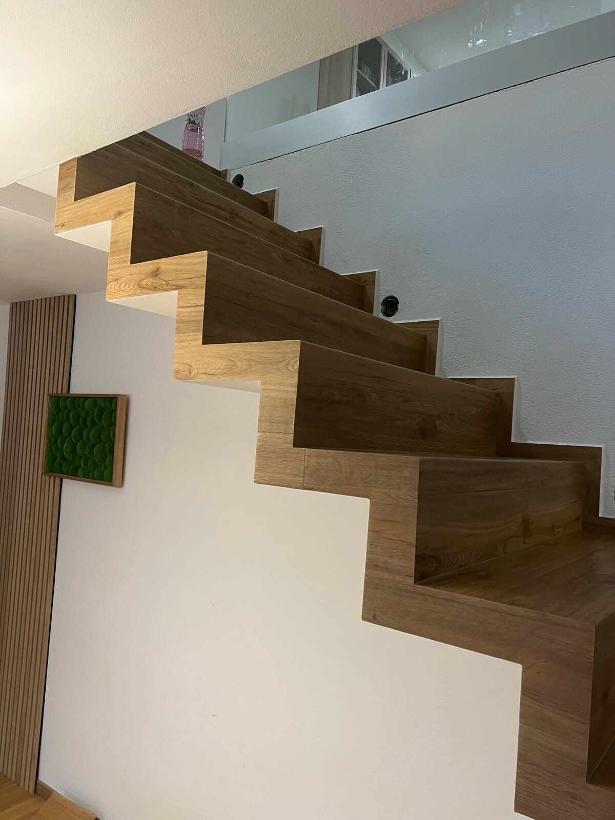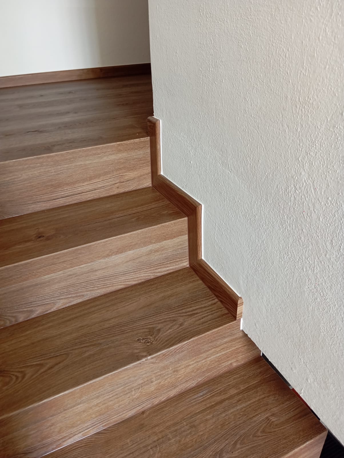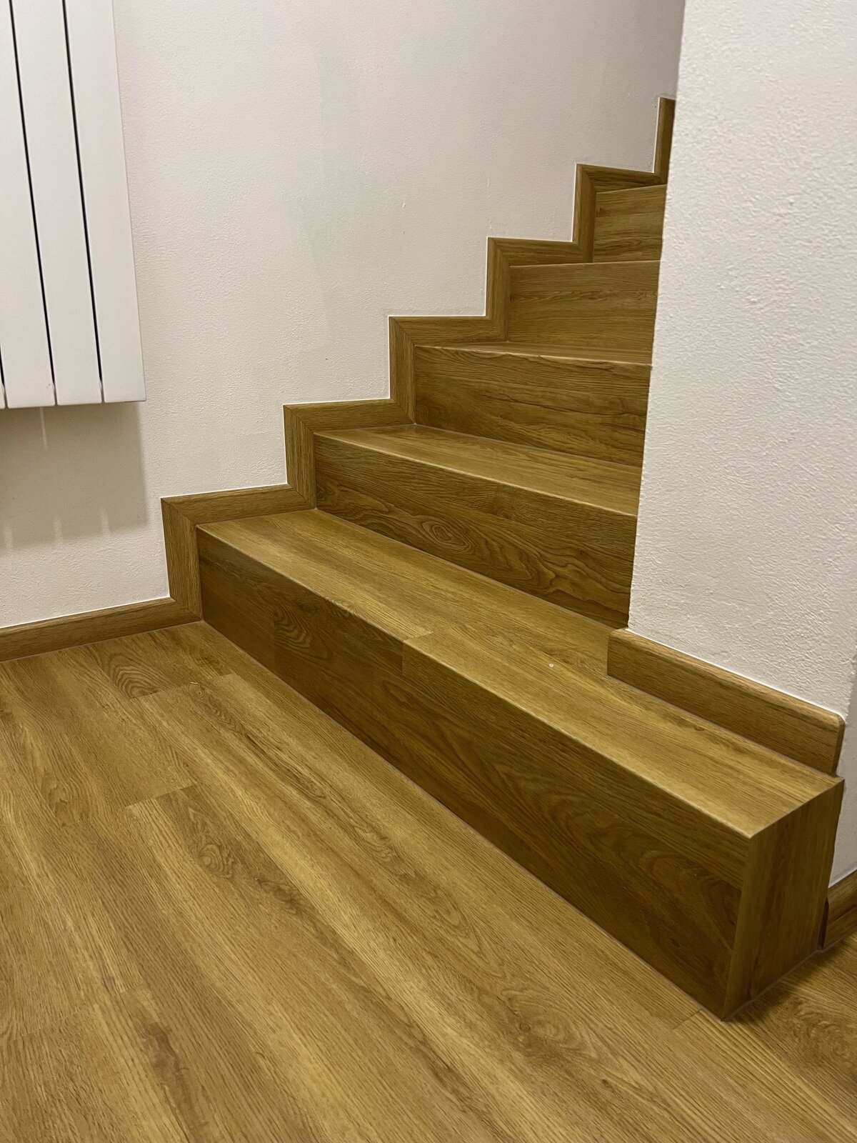 V této galerii najdete ukázky realizací vinylových schodů bez nosu provedených technologií BUKOMA®. Tento způsob obkladu poskytuje čistý, moderní vzhled a zvýrazňuje minimalistické linie interiéru.