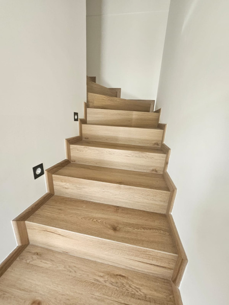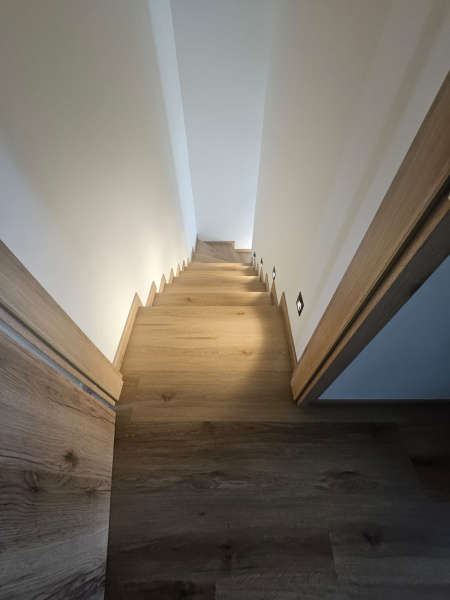 Soklové zapravení bylo provedeno pomocí lišt BUKOMA PROFI 60, které dokonale ladí s dekorem podlahy. Díky tomu schodiště působí jednotně a esteticky sladěně, bez zbytečných přechodů a narušení designu. Lišty BUKOMA PROFI 60 jsou navrženy tak, aby dokonale kopírovaly odstín i texturu podlahového dekoru, což zajišťuje harmonický vzhled celého prostoru.